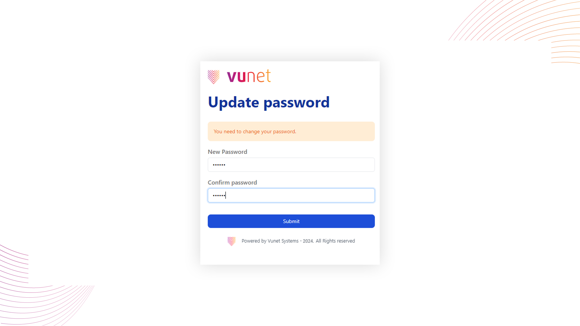 - On clicking the link, you will be redirected to the following page. Enter your new password, re-enter it to confirm, and click Submit.