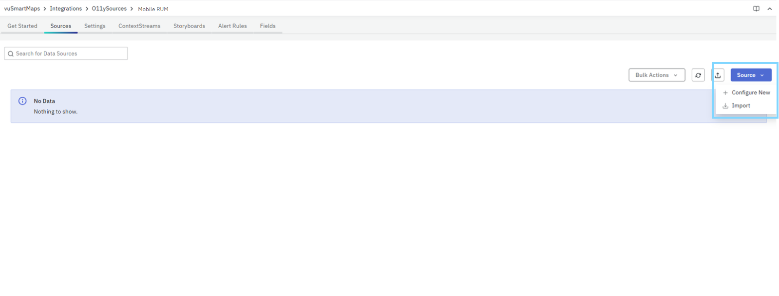 Go to the Sources tab inside the Mobile RUM O11ySource. Click Source (top-right) → Configure New.