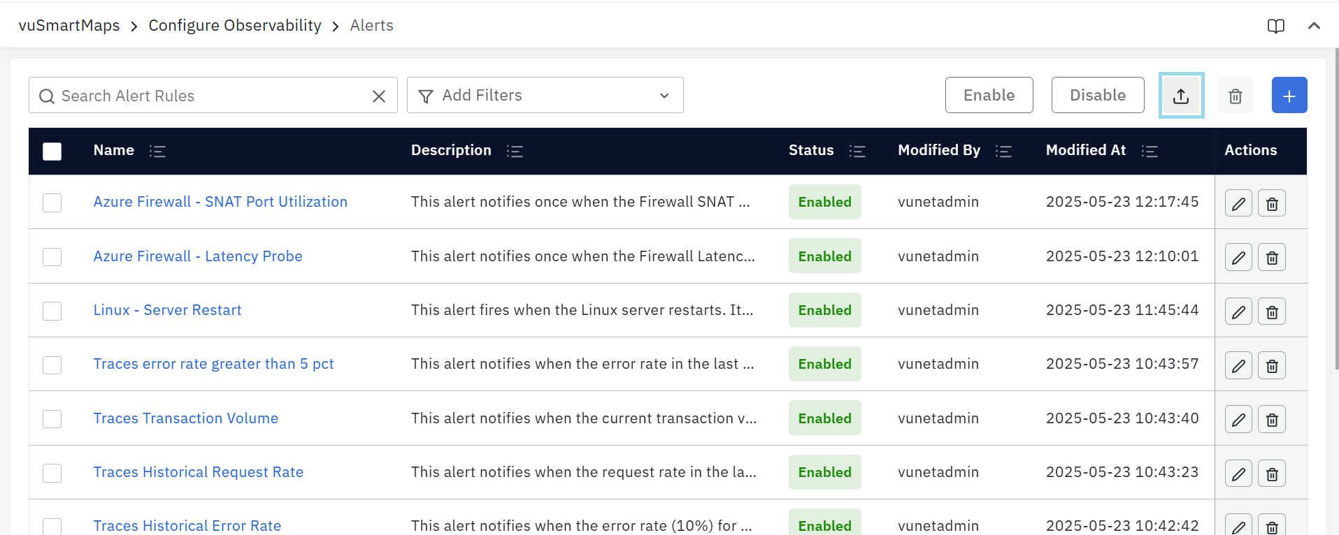 vuSmartMaps introduces the ability to export alert rules as a CSV file from the Alerts page. Users can simply click the new Export button next to the Disable option, confirm the action, and download the alert rules for offline use. This simplifies the sharing of alert configurations. Learn more about it in Alerts - Manage Alerts.