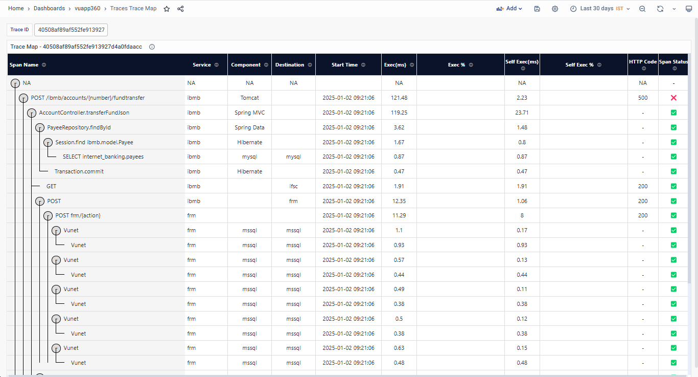 The Trace Map is a new, interactive tool for analyzing trace data with clarity and efficiency. It provides a detailed view of your application's traces, breaking them into spans that represent specific operations or functions. Replacing the Flame Graph, List View, and Database View on the Traces Overview Dashboards, the Trace Map simplifies trace analysis, helping users quickly identify bottlenecks, diagnose errors, and find optimization opportunities. For more details, explore vuApp360 - Trace Map.
