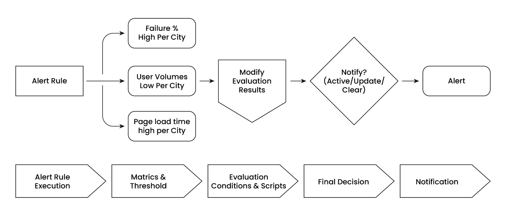 vuSmartMaps lets you use Python scripts to create programmable alerts. Using an evaluation script, you can generate alerts for breaching any business logic. Below is a typical alert engine execution workflow and where the evaluation script is used.