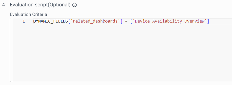 To configure Related dashboards of an alert, use the YAML configuration as shown below. “Device Availability Overview” is the name of the dashboard which is preconfigured and called here.