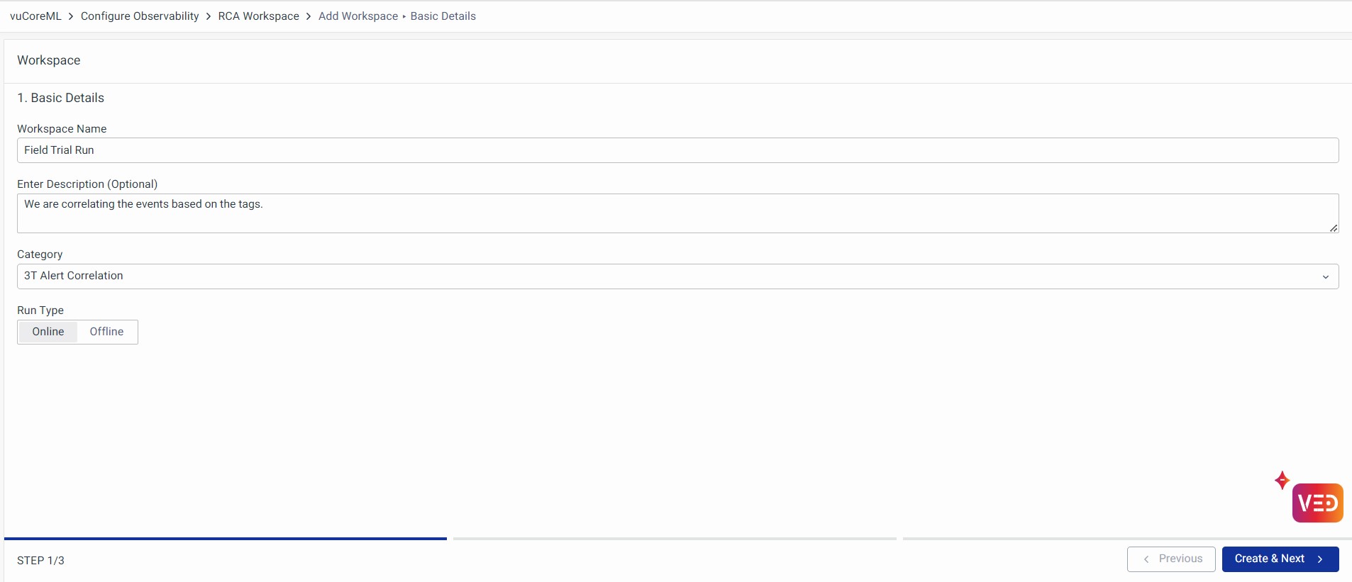 Enter the Workspace Name, Description, select the Category as 3T Alert Correlation, and choose the Run Type as Online or Offline.