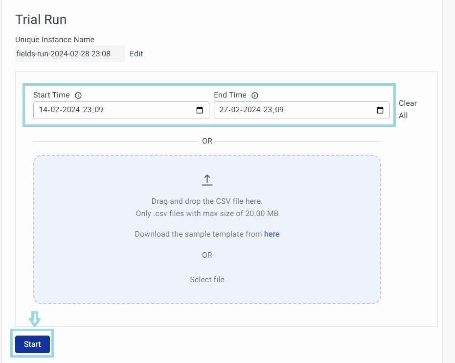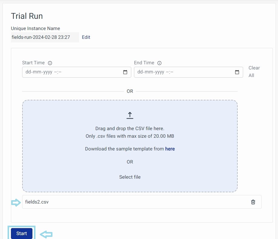 Alternatively, you can upload a CSV file to correlate the events and click on the Start button.