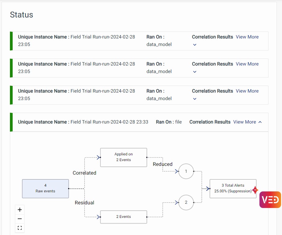 You will find the correlated alerts that appear below. Here out of 4 raw events, 2 events were correlated and brought down to 1 event. You can notice an amazing 25% suppression.