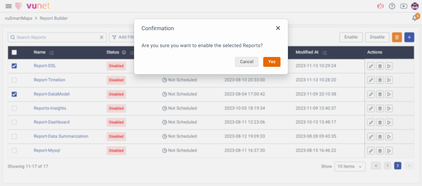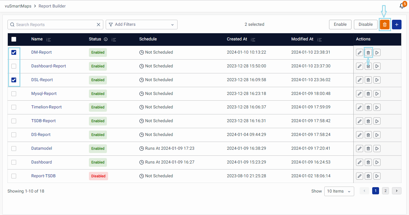There are two instances to delete the report: one is from the report listing page under Report Builder, and the other is deleting the generated reports.