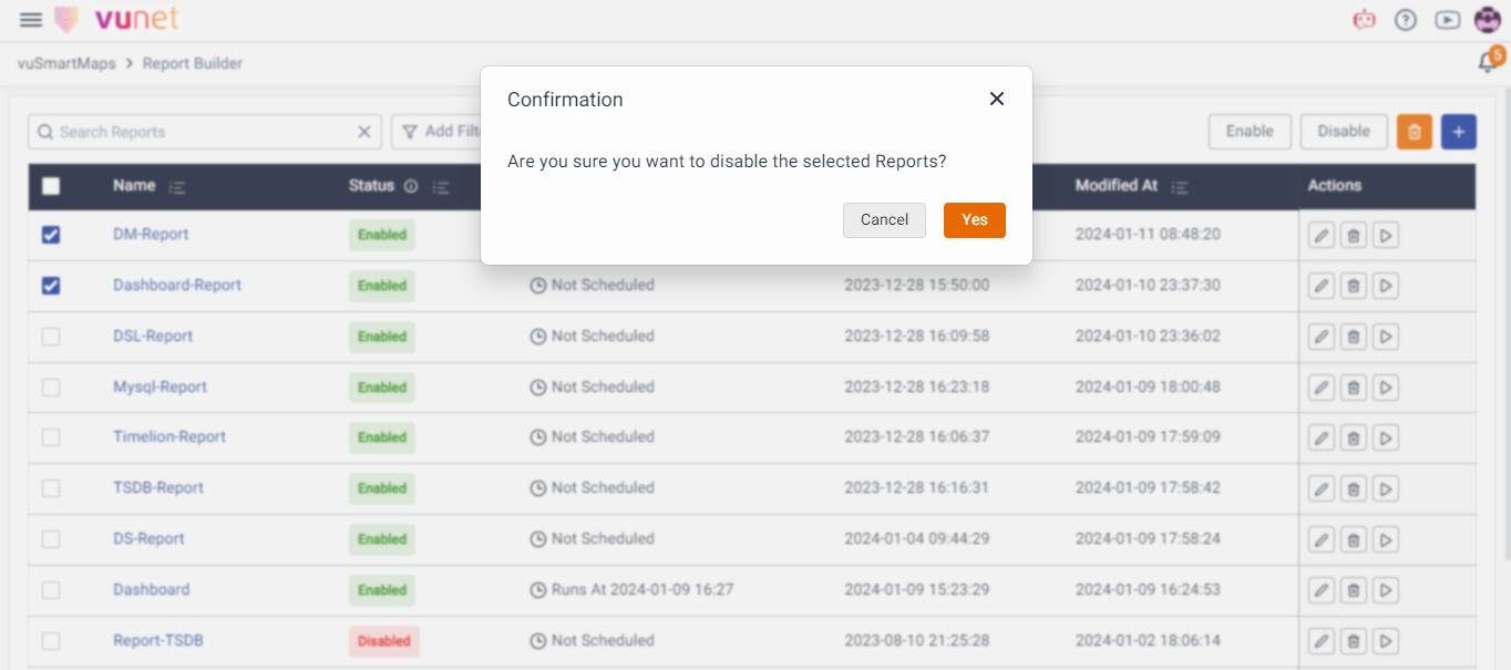 To disable a report, select its checkbox, which activates the 'Disable' button. Click Disable. Disabled reports are not available for users to generate reports. You can disable multiple reports simultaneously.