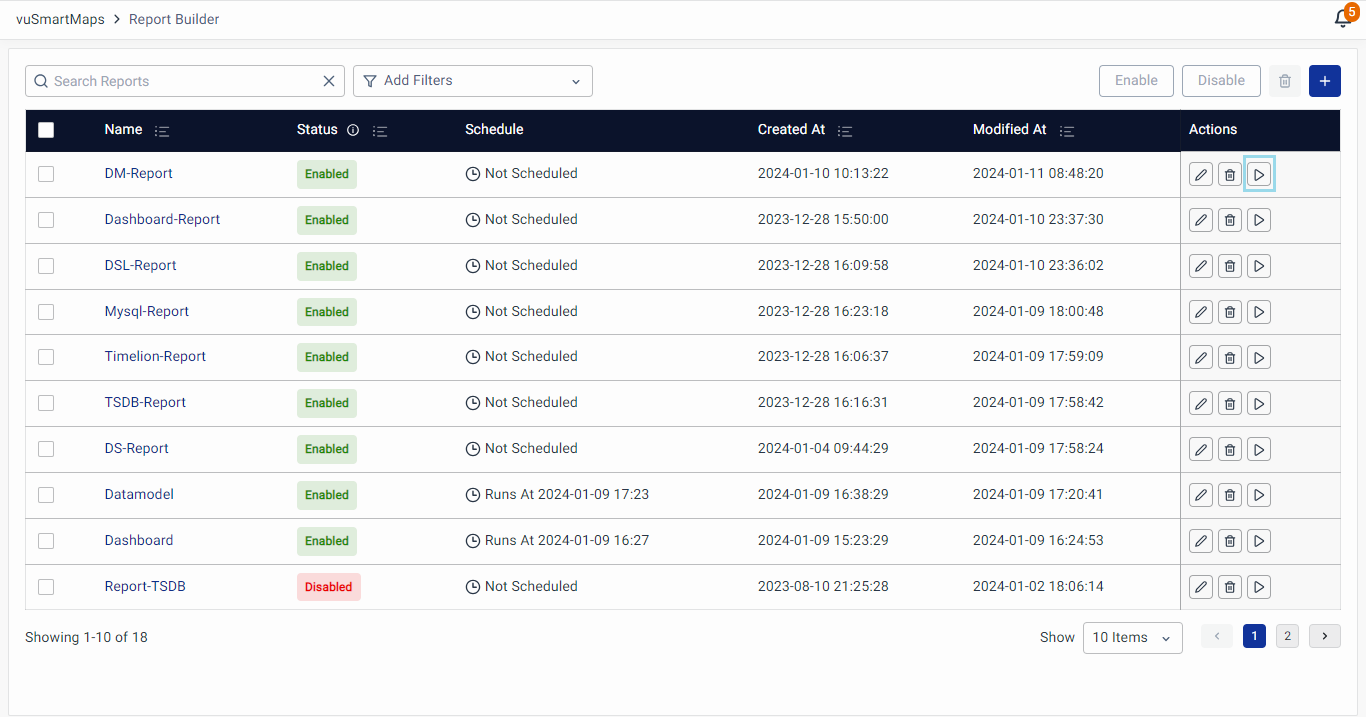 Manage your reports efficiently using configurable settings and permission controls, with options to enable, disable, edit, view, delete, or duplicate reports