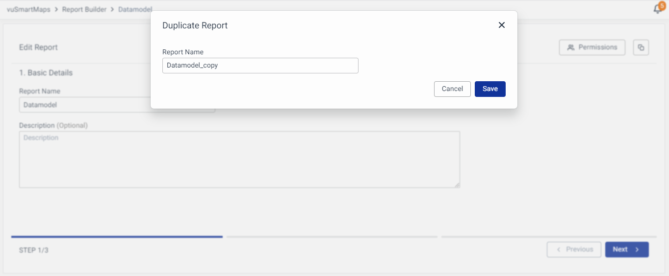 On clicking the Duplicate report the pop-up will appear, and by default, the report name will be suffixed as ” _copy” to have uniqueness. For example, a duplicate Datamodel report will be named Datamodel_copy. Users can also rename the report at a later time.