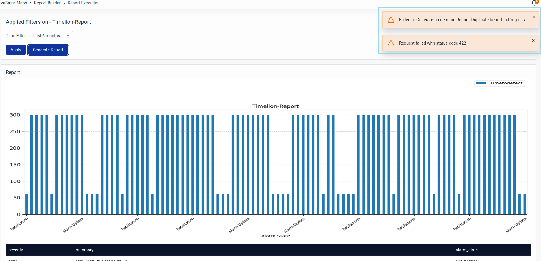 If a report generation is in progress, the user will be notified that they can't generate the same report again, until the initial report generation is successful.