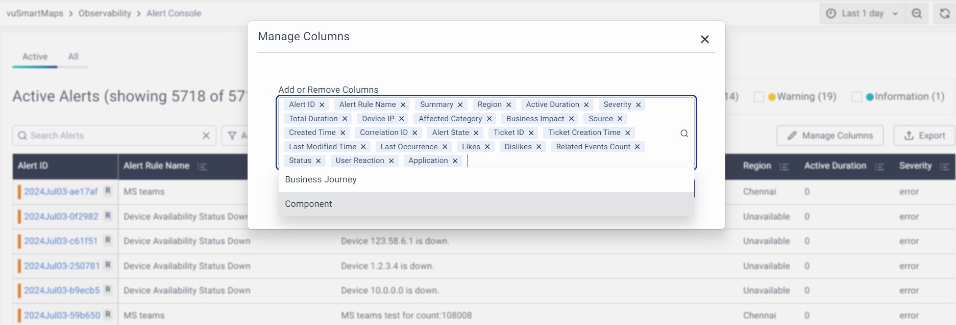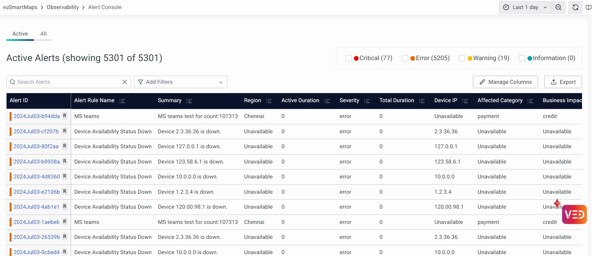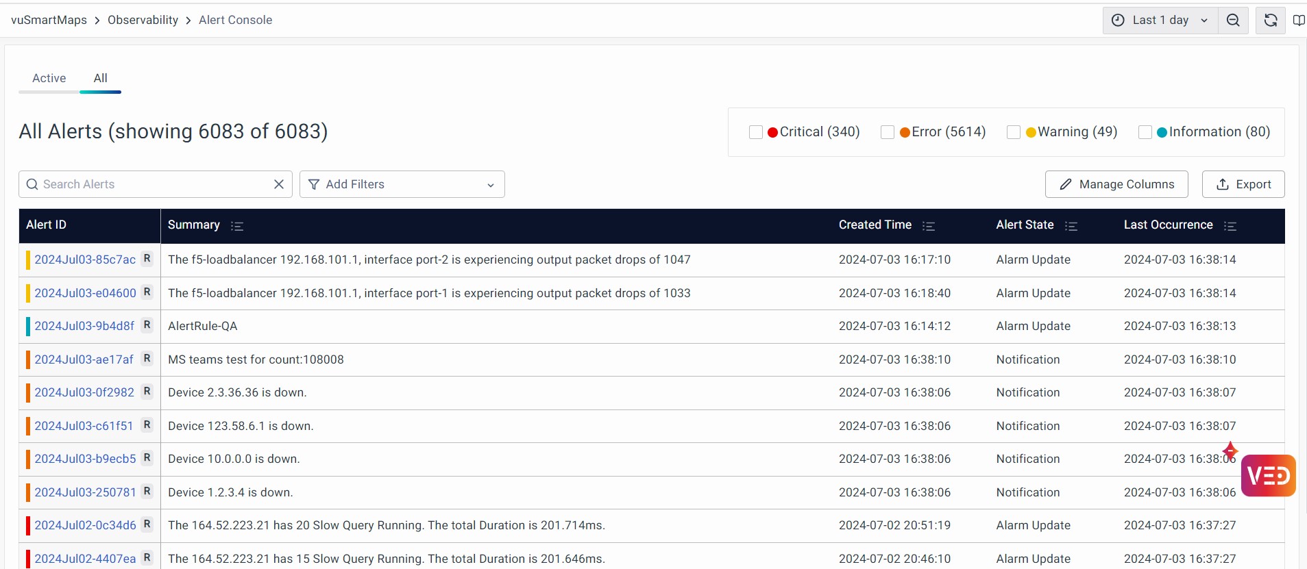 vuSmartMaps Alert Console can be accessed by navigating from the left navigation menu (Observability > Alert Console).