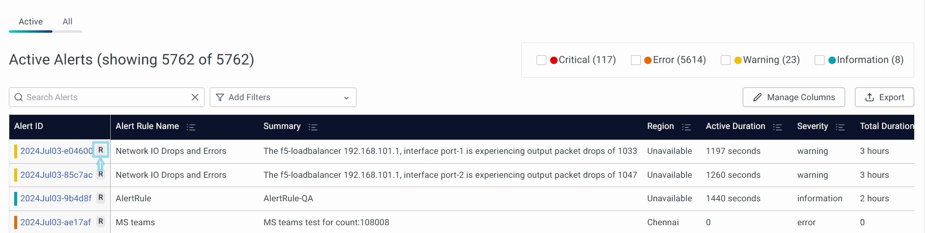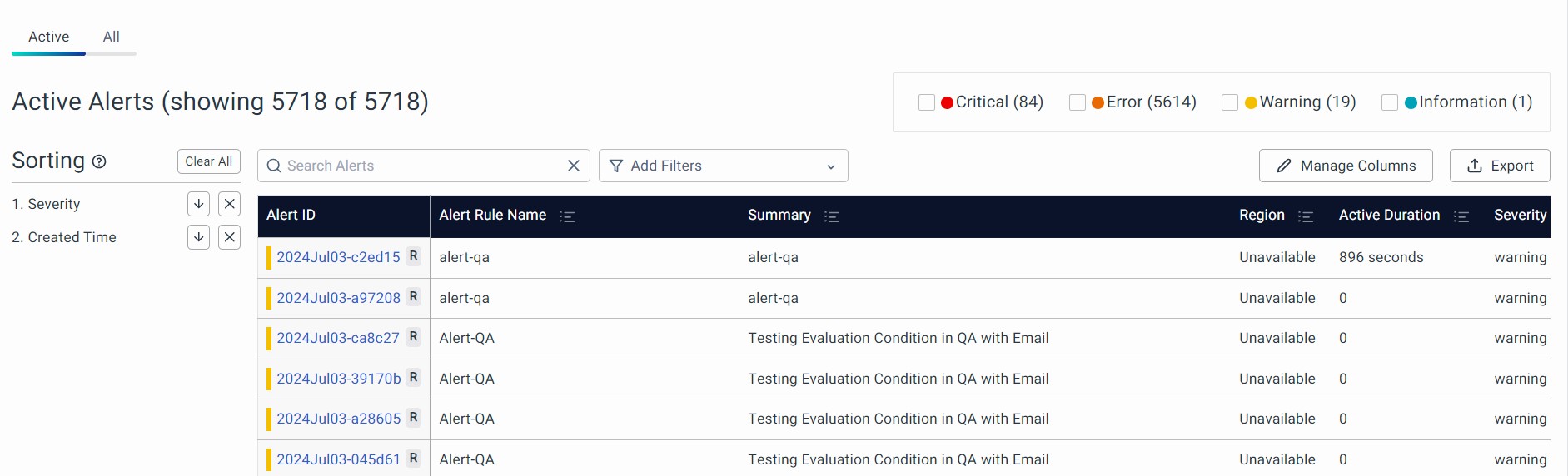 Active Alerts: This tab lists the detailed view of ‘Currently Active Alerts’ that were triggered during the specified period.