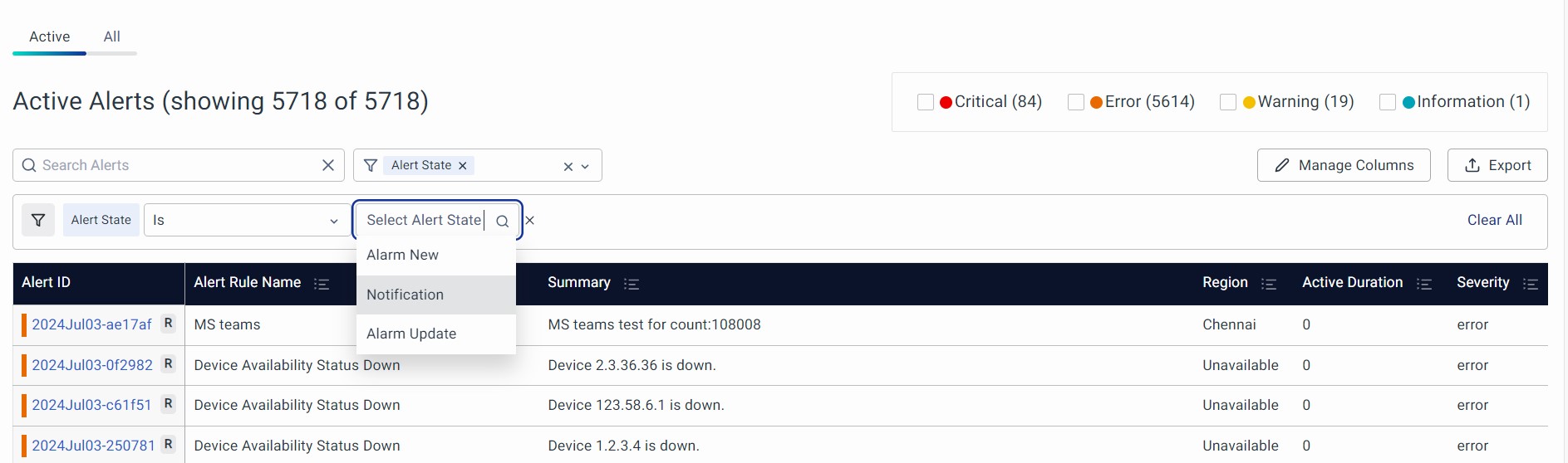 - Alert State: The current state of the alert, with possible values - Notification, Alarm New, Alarm Update, or Alarm Clear.