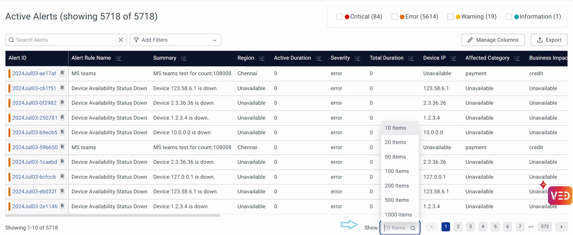 - Adjust Alerts Display: You can use the dropdown selector at the bottom right of the page to choose the number of Alerts to display in the listing table.