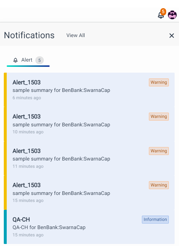 Click the Bell Notification button, and then select View All at the top right of the page. In the Alert Console, you'll find a list of notifications generated by the system, with detailed information about each event, including associated metrics and historical data.