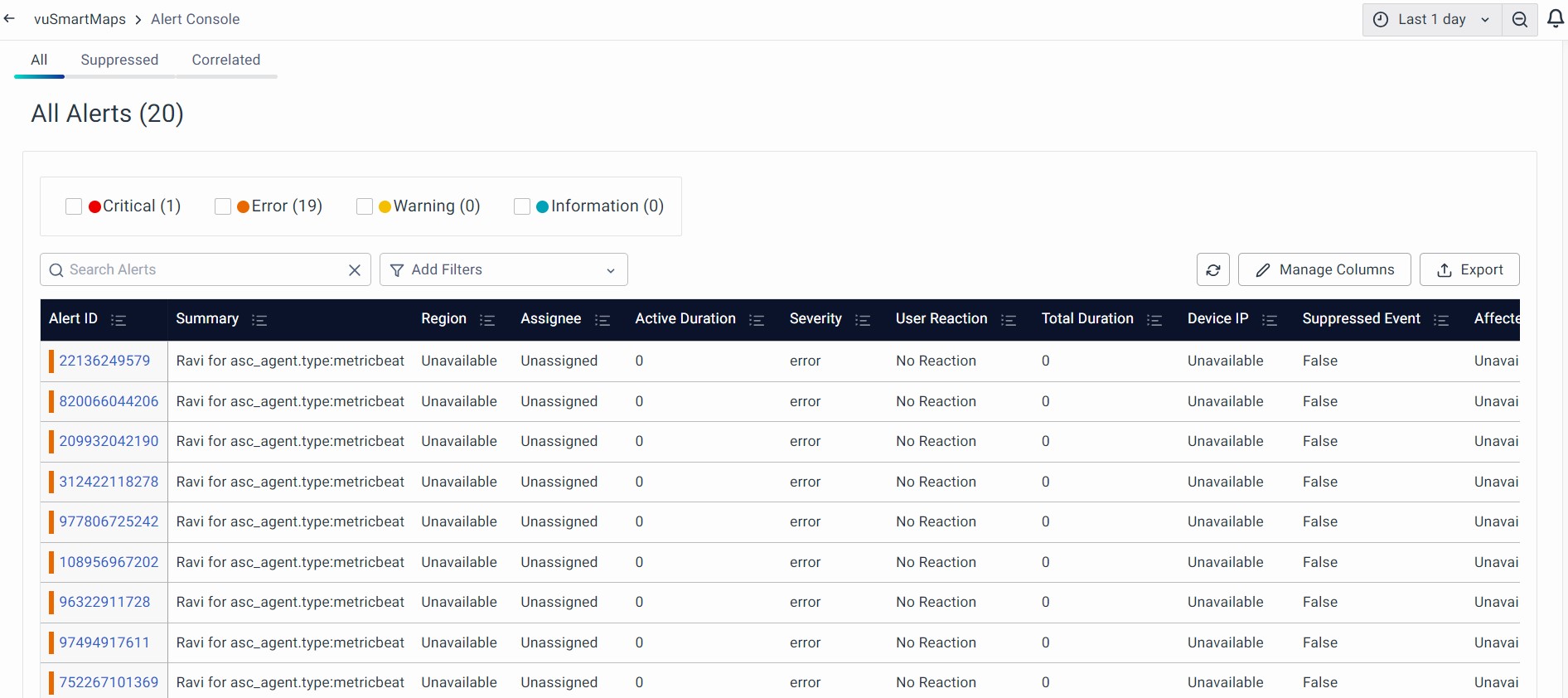 You'll find this bell-shaped notification icon in the top right corner of all vuSmartMaps pages. It shows recently generated notifications when you're logged in. New notifications are indicated by a red notification count on the bell button. It always shows the most recent 5 alerts and once you open the notification by clicking the bell icon, you can go to Alert Console to check the specific alert or all alerts.