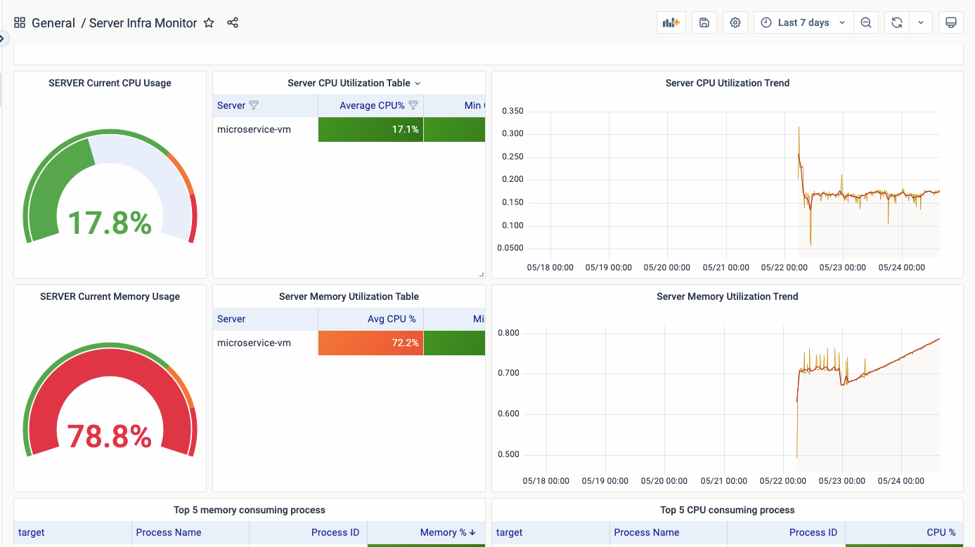 You can select various panel types within the same dashboard and arrange them side by side to assess the impact of server health from different components and vice versa. This allows for a comprehensive understanding of the overall server health status.