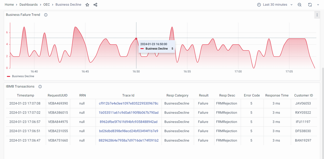 For instance, if you want to analyze the business decline in the selected time range, you can check the panel showcasing the graphical representation of the Business Failure Trend, along with a tabular representation of the transaction.