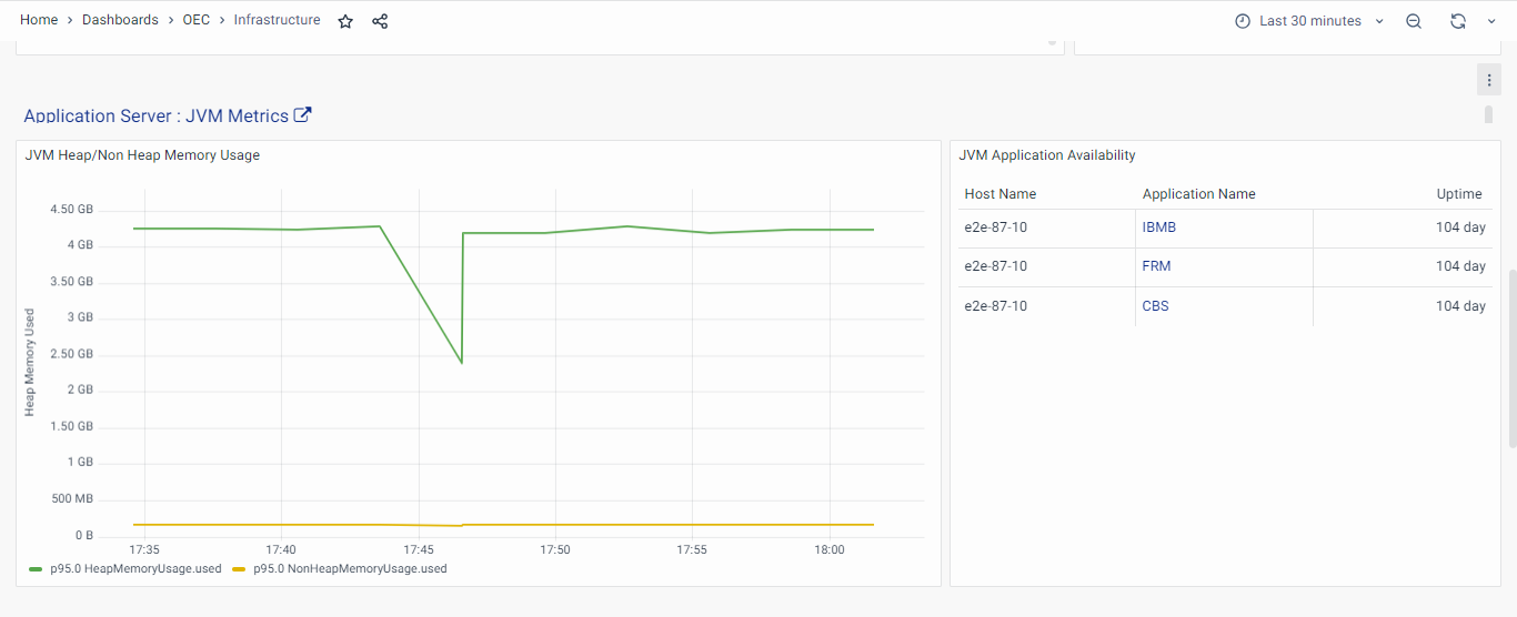 Similarly, the Application Server trend chart highlights Heap Memory Usage in the selected time range.