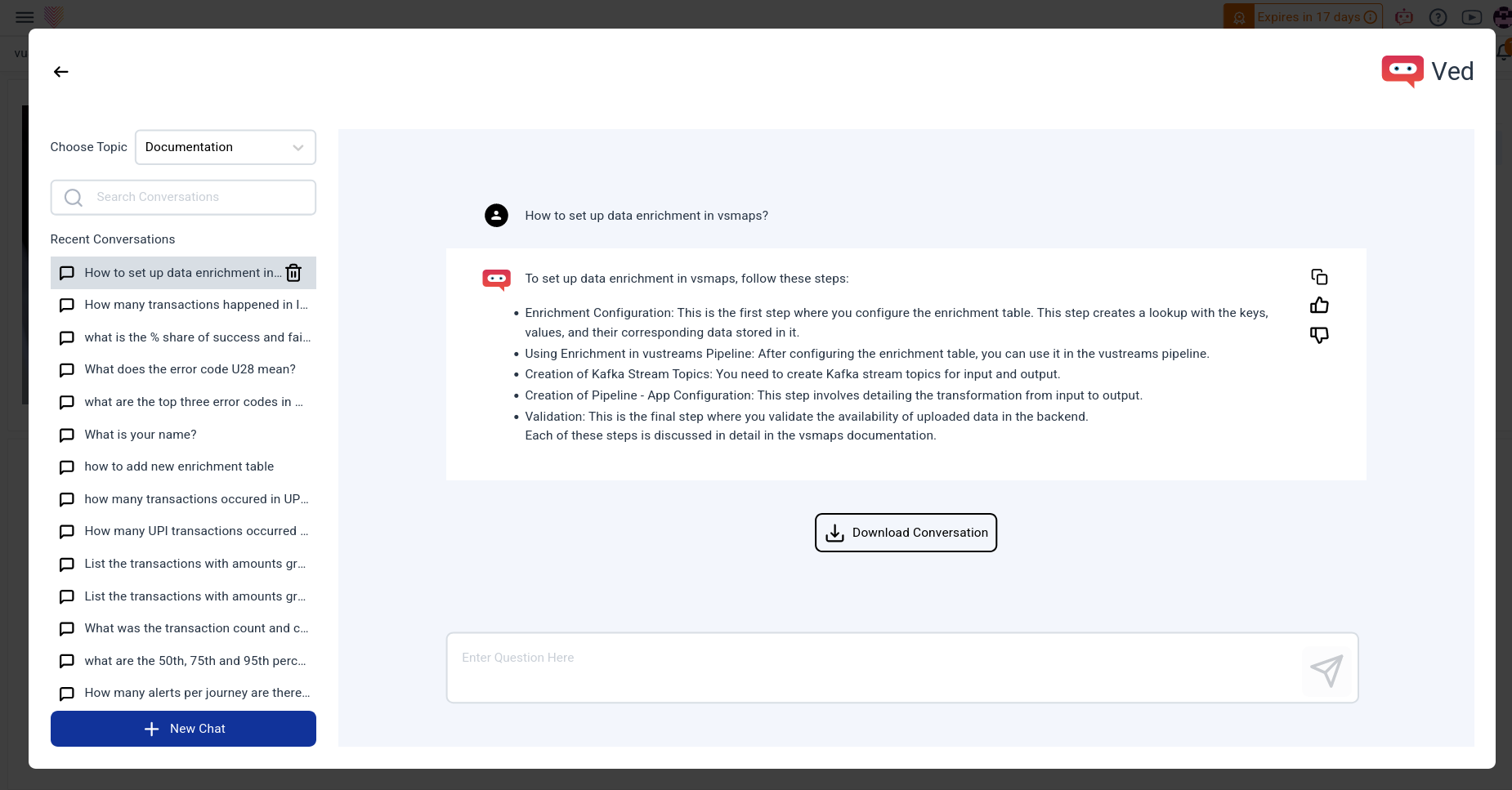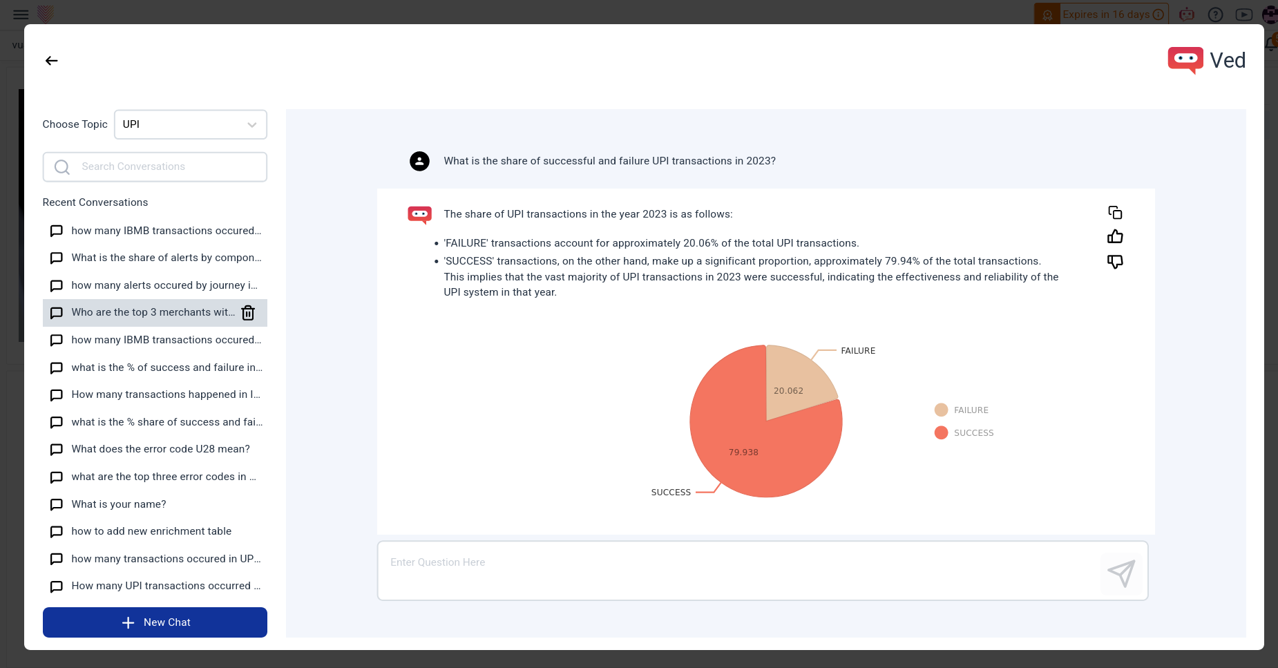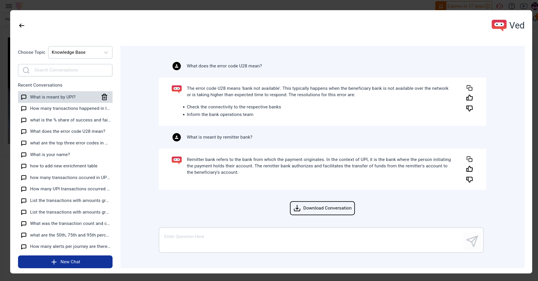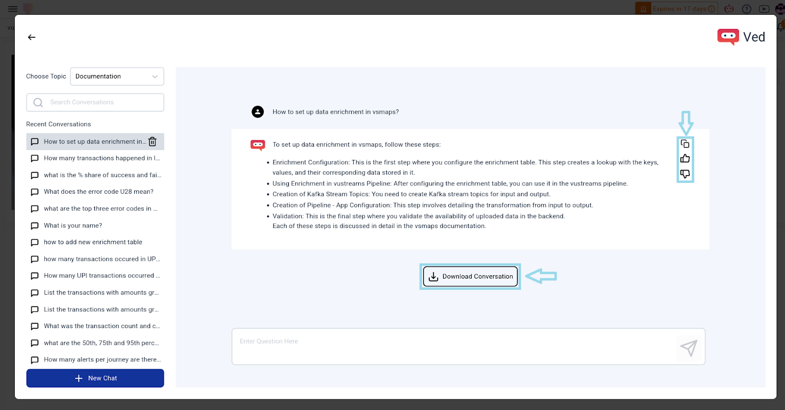 Users actively shape responses through interactive feedback, and comprehensive answers, including text and charts, enrich the user experience. A one-click download feature ensures seamless documentation of interactions. Ved transforms the application experience, fostering increased engagement, streamlined support, and a more intuitive user journey.