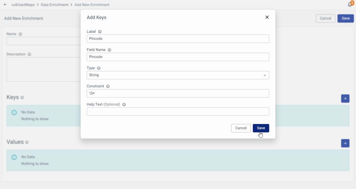 To add Keys to Enrichment Table, click on the + icon in the Keys section and fill the respective information related to the Keys. The following information is required for adding the Keys: