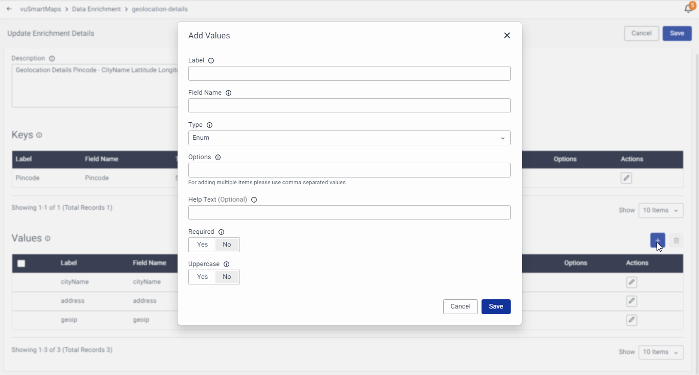 To add Values in the Enrichment Table, click on the + icon in the Values section and fill in the respective information related to the Values. The following information is required for adding the Values: