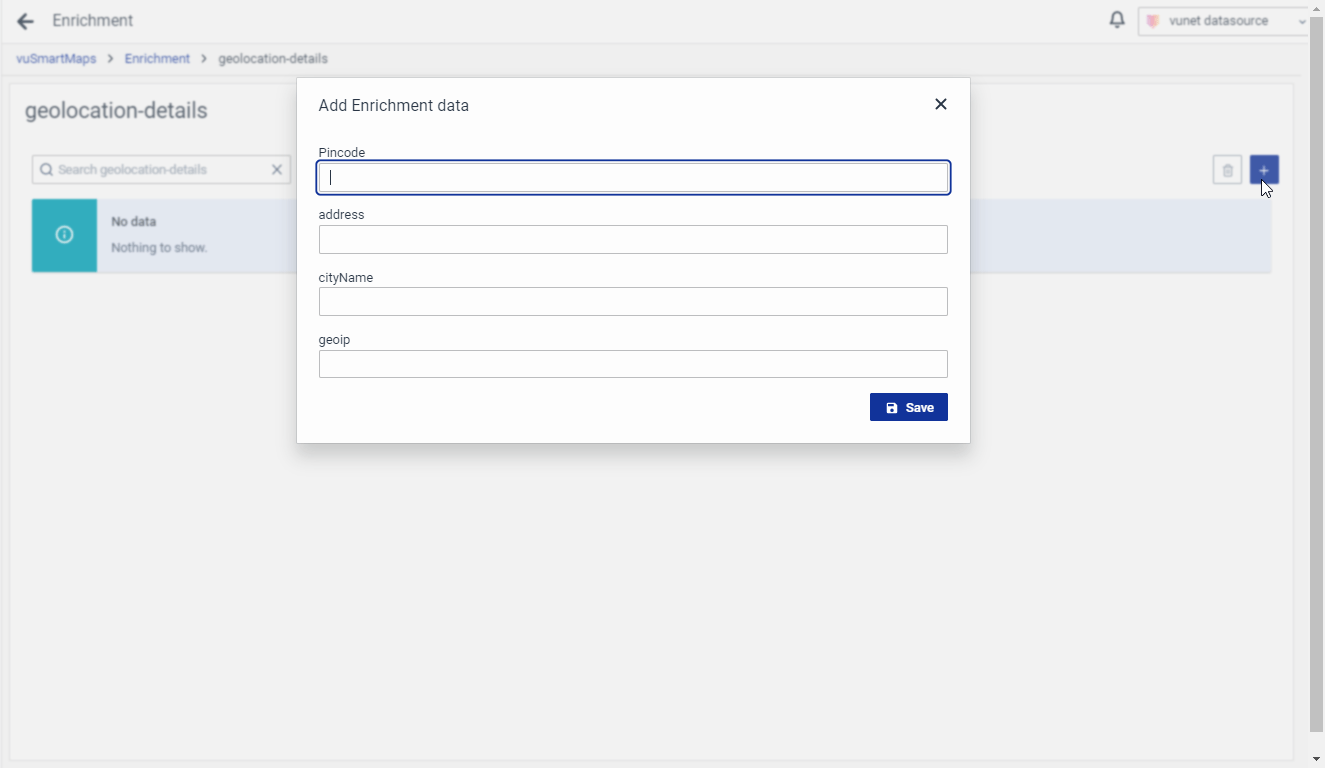 For the geolocation use case, the following entries may be done for Keys and values. After adding the required fields, the enrichment table page will look like the following: