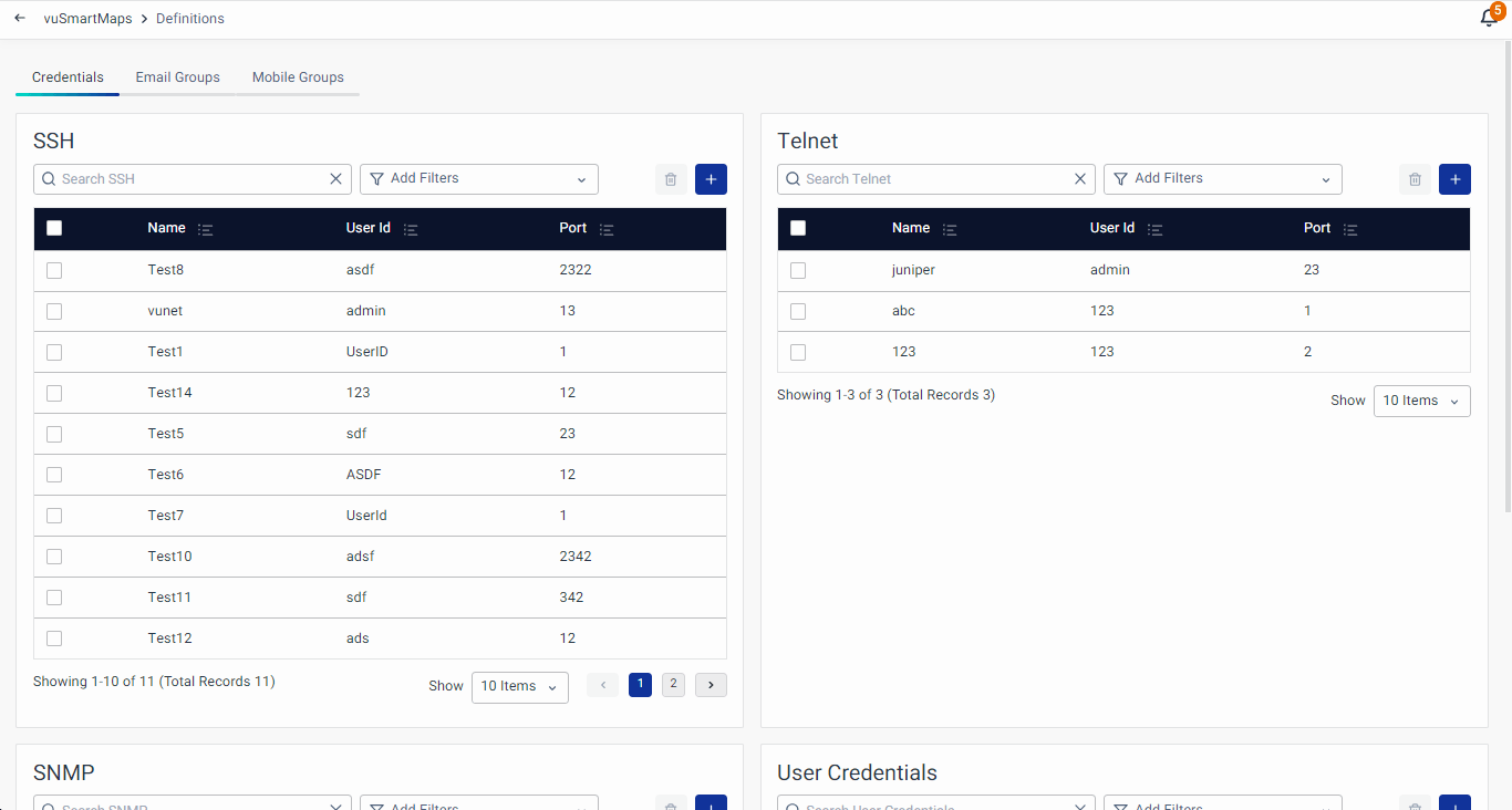 The Definitions module plays a pivotal role in vuSmartMaps by allowing users to configure credentials and communication groups. Its importance lies in ensuring secure access control and efficient communication within the platform. Users can establish various credentials like SSH, Telnet, SNMP, User, and Cloud Provider, simplifying authentication processes. Additionally, Definitions facilitates the creation and management of Email groups and Mobile groups, making it convenient to organize users for notifications, alerts, reports, or other forms of communication.