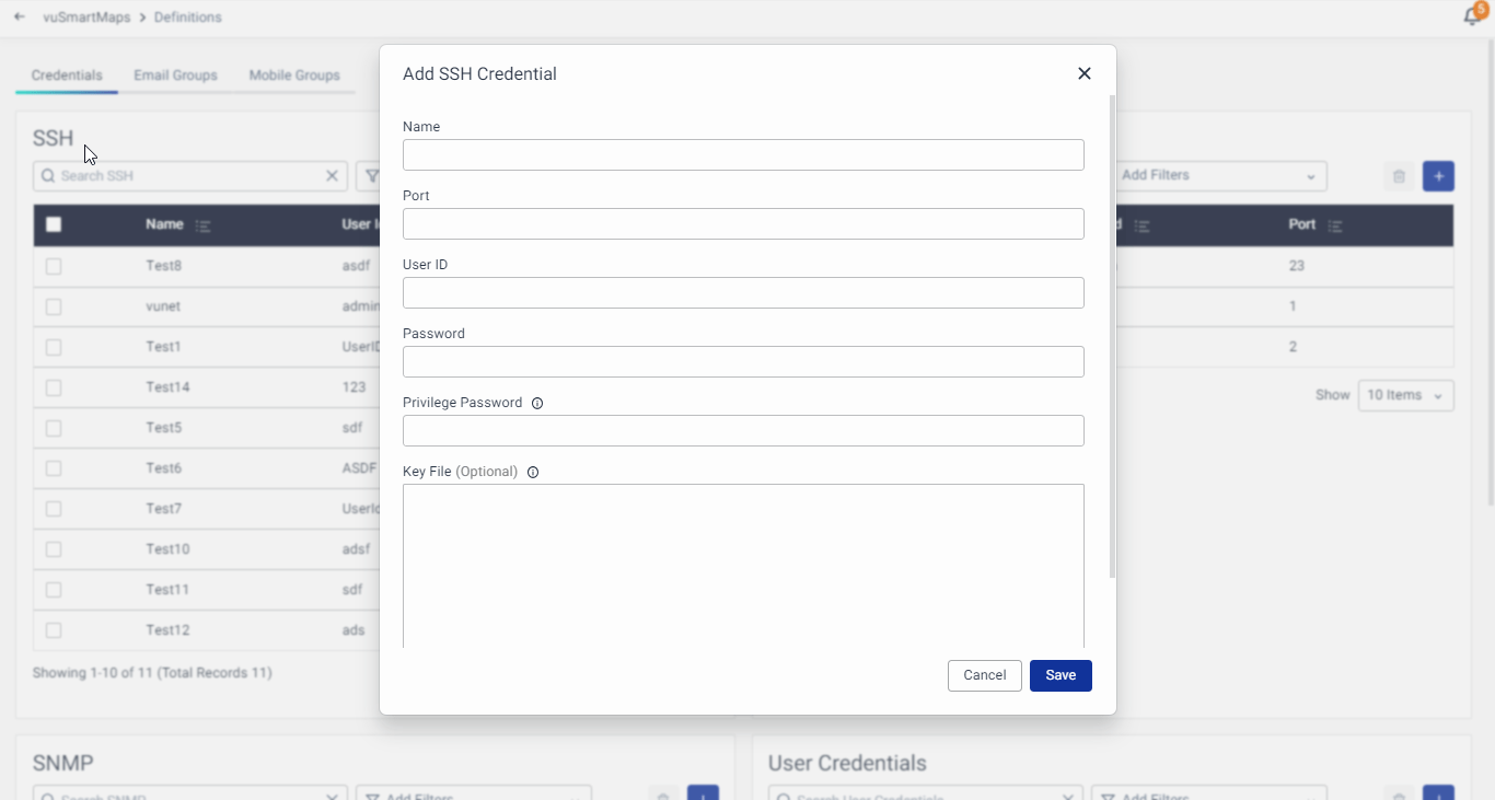 Secure Shell (SSH) is a cryptographic network protocol used for secure remote login and command-line execution. It ensures secure communication over unsecured networks and is commonly used for accessing and managing remote systems. SSH credentials are used by the Command Line Interface (CLI) and Configuration Collector data source to allow vuSmartMaps to communicate securely with client environments.