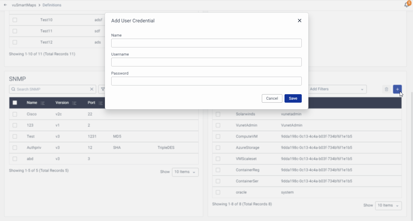 vuSmartMaps relies on various types of credentials for different activities, including data collection. These credentials are managed within vuSmartMaps under Platform Settings > Definitions > Credentials. The following landing page is shown when navigating to Credentials.