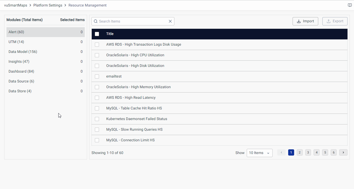 Resource Management in vuSmartMaps simplifies the organization, control, and efficient handling of vital platform components. This tool encompasses dashboards, alerts, data models, insights, dashboards, data sources, and data stores. It facilitates easy packaging of these components into the platform, promoting sharing, deployment, and reuse.