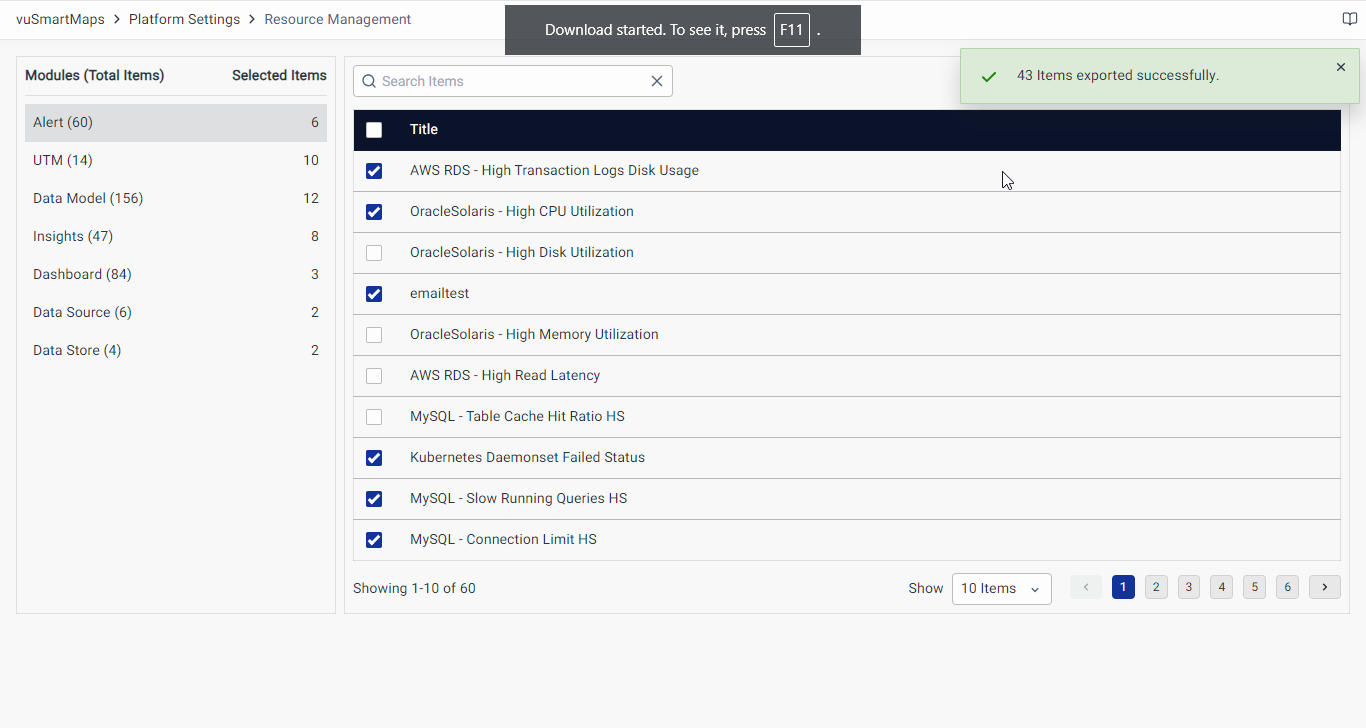 In this use case, Resource Management empowers you to efficiently export various components, ensuring a seamless and straightforward experience. It centralizes access, simplifies selection, and ultimately boosts productivity, enabling you to make the most of your vuSmartMaps platform.