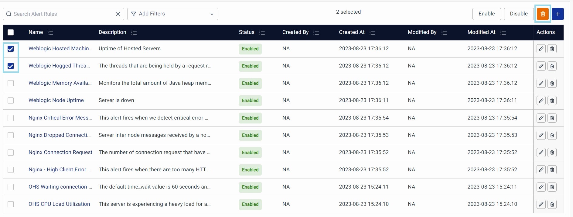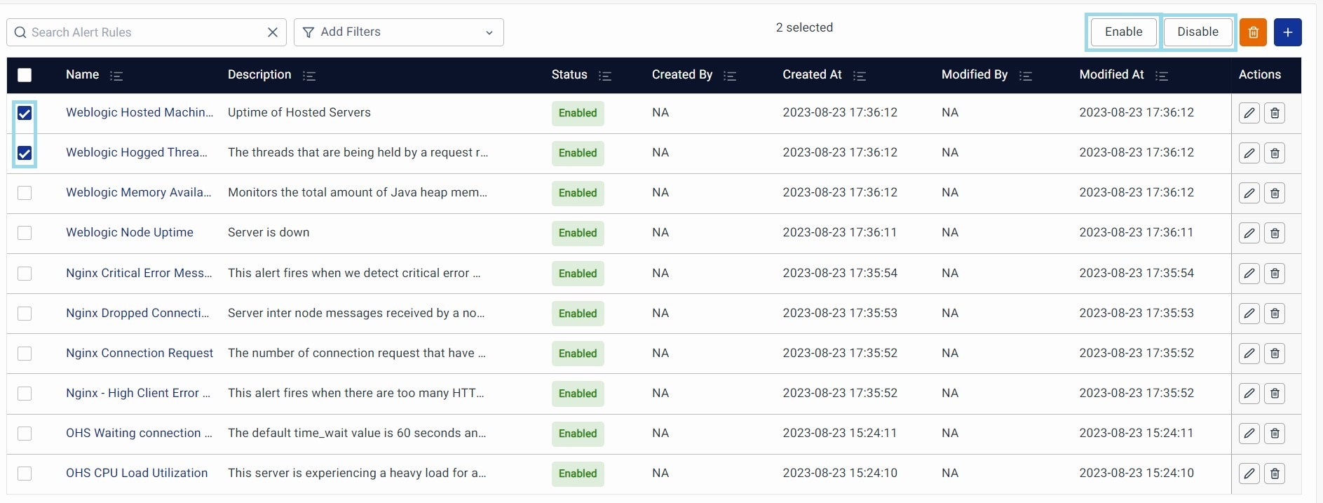 Enable: Check one or more Alert Rules and click Enable.
