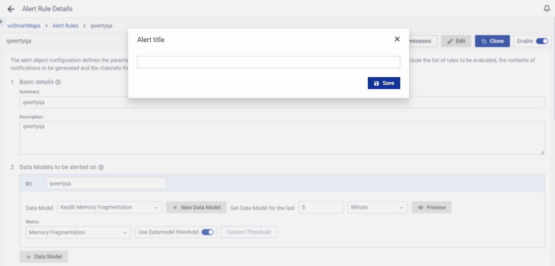 Clone: Click on this to replicate the current Alert Rule. This is the easiest and quickest way to duplicate an existing Alert Rule and make the relevant changes to match your requirement.