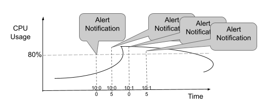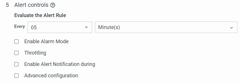 When you disable alarm mode for an alert configuration, the system will keep generating notifications at regular intervals, usually every 5 minutes, as long as the alert conditions remain true. No tracking or notification is done when the alert condition is cleared.