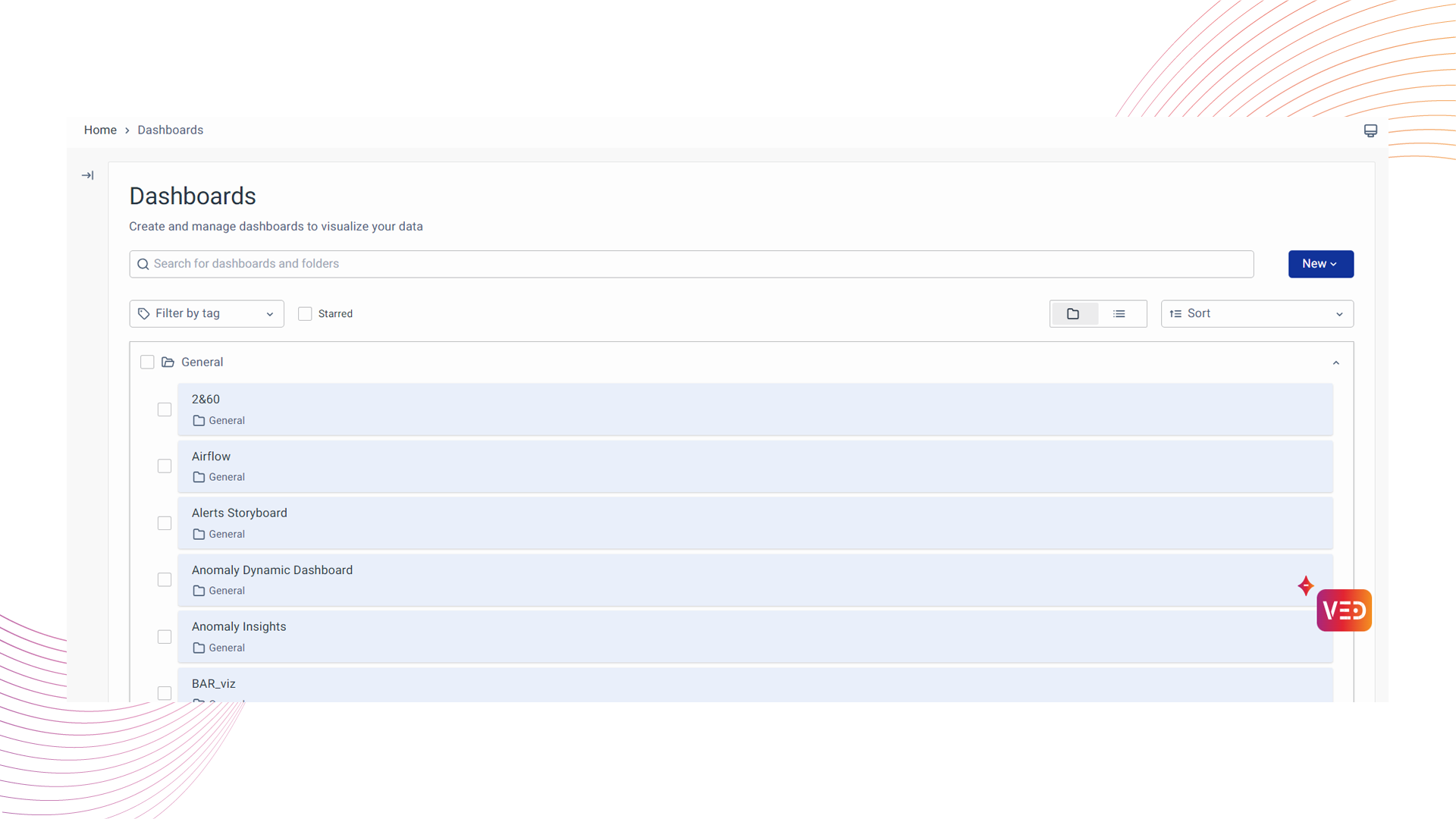 - Dashboards: Browse and perform actions like listing, deleting, creating folders, importing, and more on your dashboards.