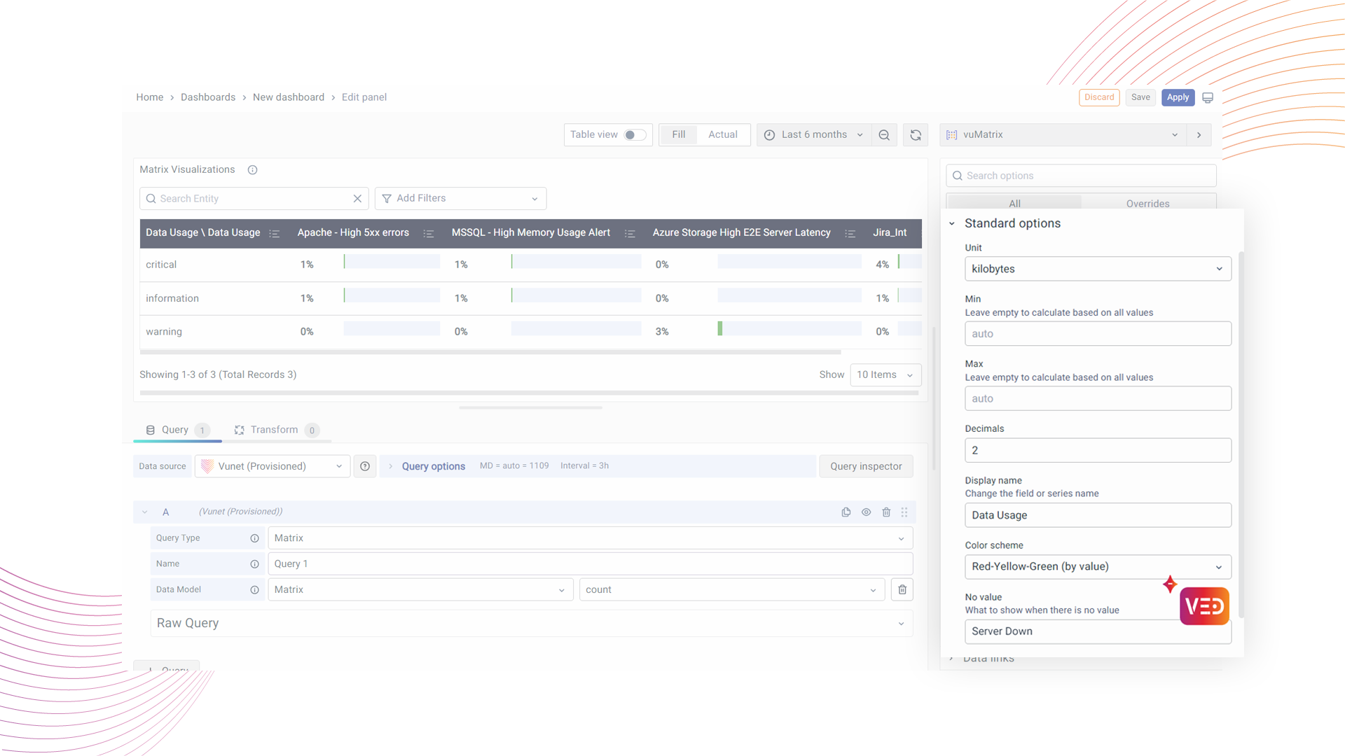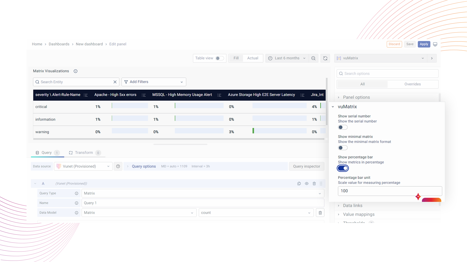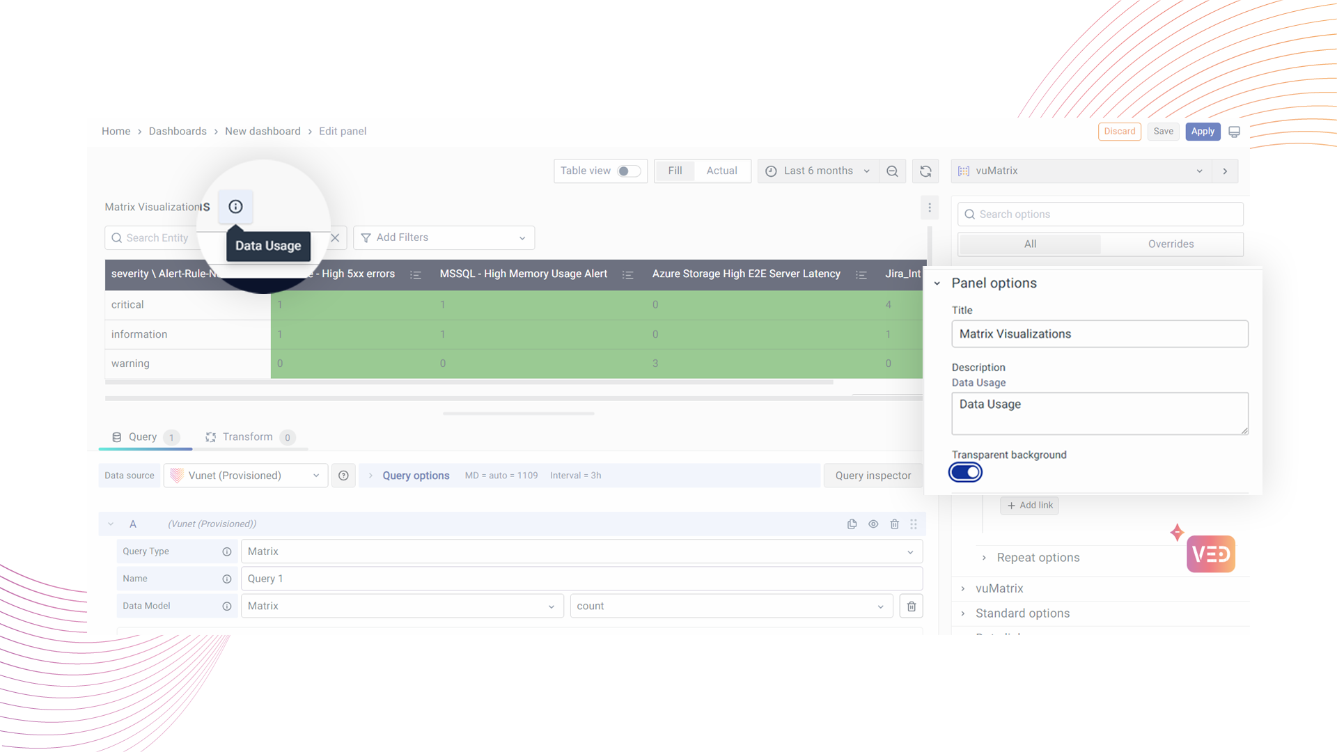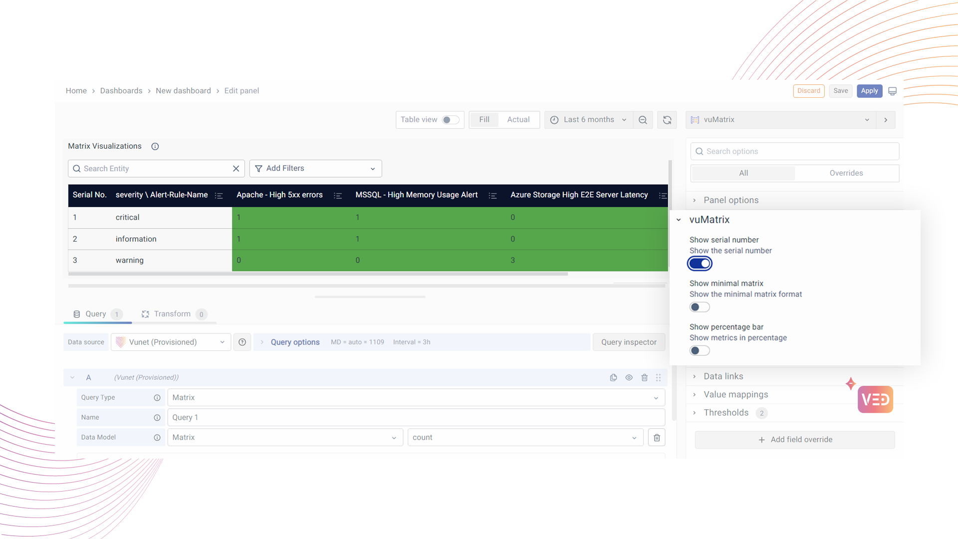 Before configuring, set the Data Source as “Vunet (provisioned) ”, as Matrix Visualization can be accessed only through this.