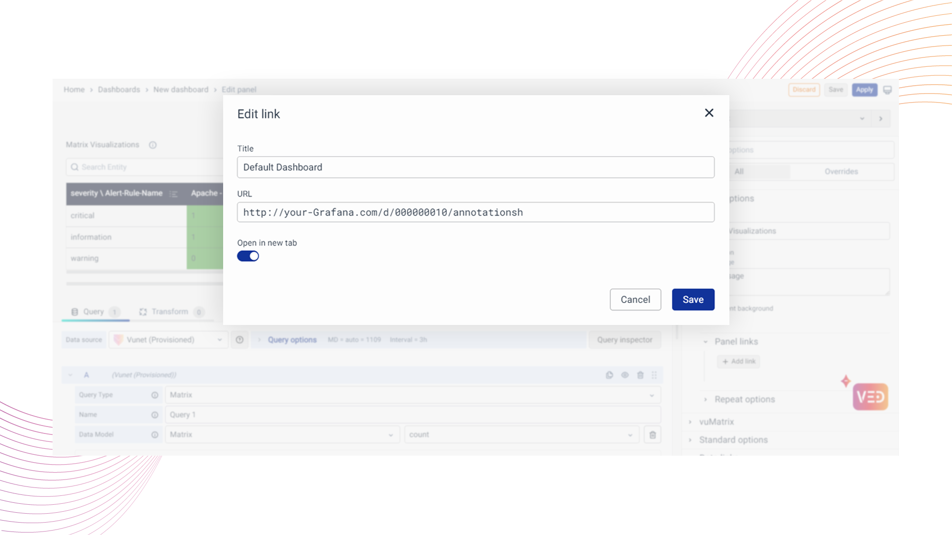 The next part of Panel Options is Panel Link where you can point a link to any other website or dashboard of your choice. Enter a title, and URL and select the ‘Open in a new Tab’ option if you want to open the link in a new tab. Click Save.