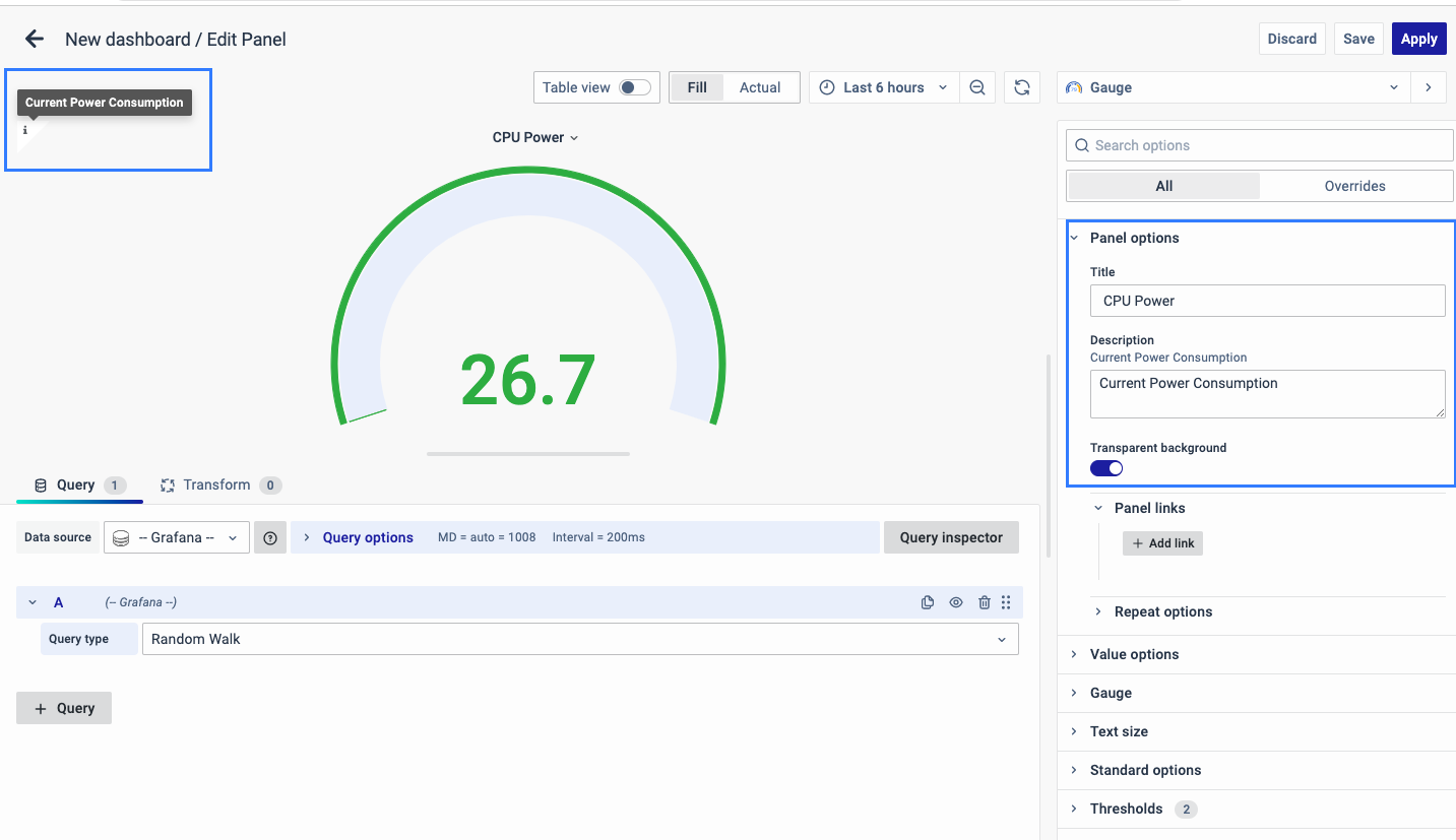 There are multiple options to edit the properties of the panel. The first one is Panel Options. Enter a Name and Description for the Panel that you want to create. For instance, if you're making a Gauge chart to track CPU current power consumption, name the panel "CPU Power" and describe it as "Current Power Consumption."
