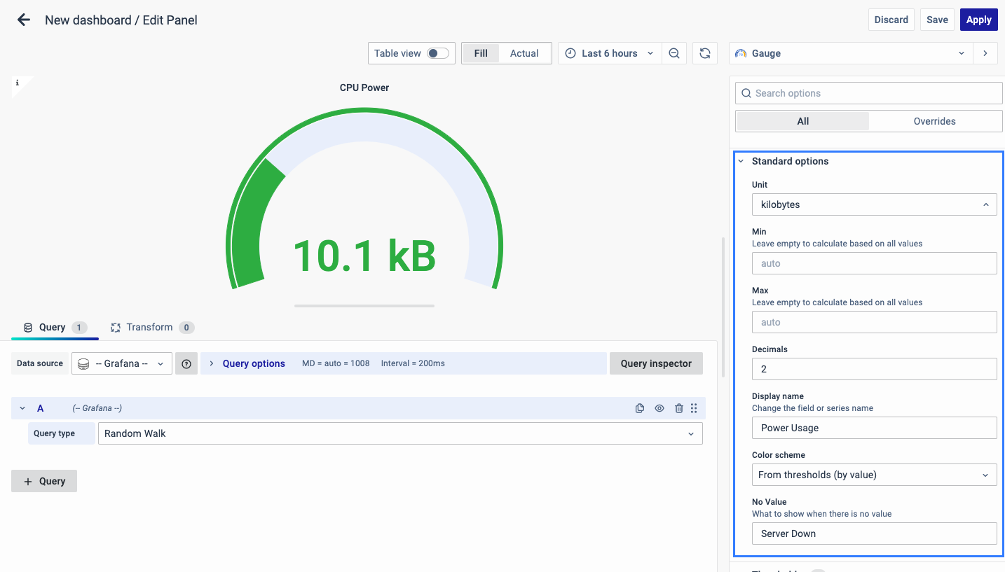 On the right side of the default screen, select Visualization as Gauge to create a Gauge Chart panel.
