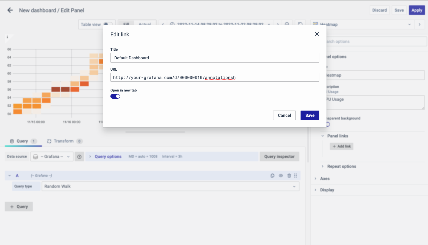 The URL can be a link to another dashboard or for getting help or useful info. When you click on a panel, it opens the link either in the same tab or a new tab, depending on your choices. For example, if you want to compare a default dashboard, just click the link to open it.