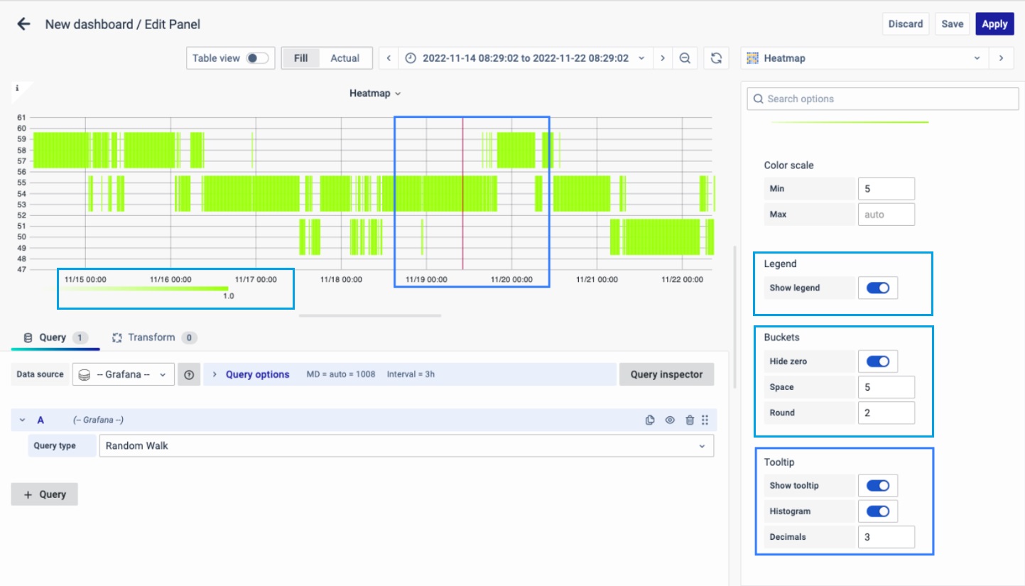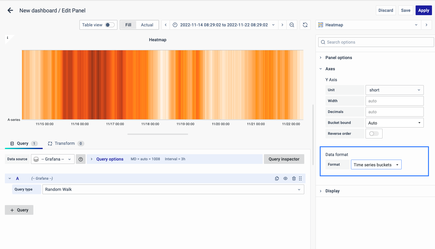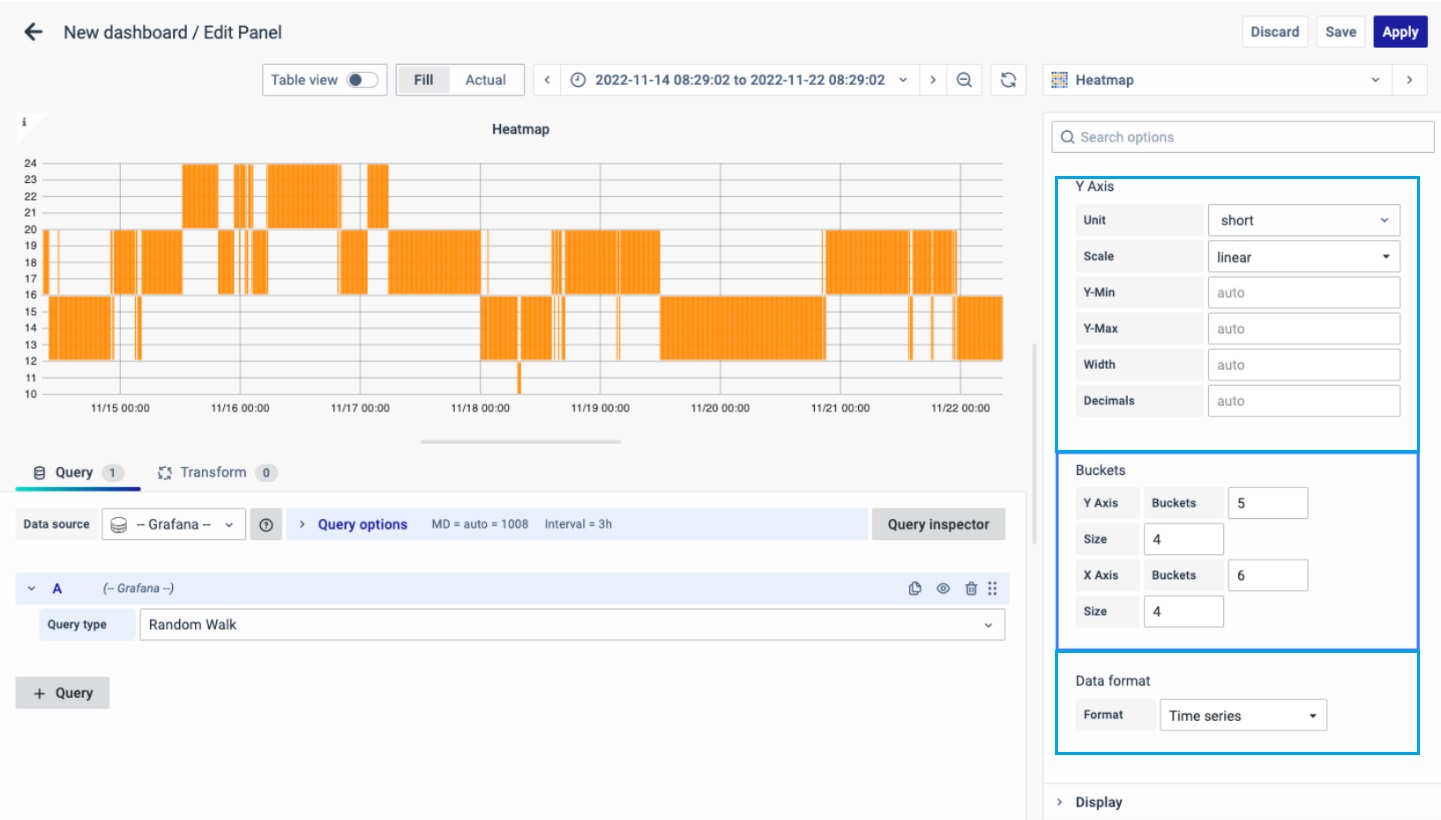 On the right side of the default screen, select Visualization as Heatmap to create a Heatmap panel.