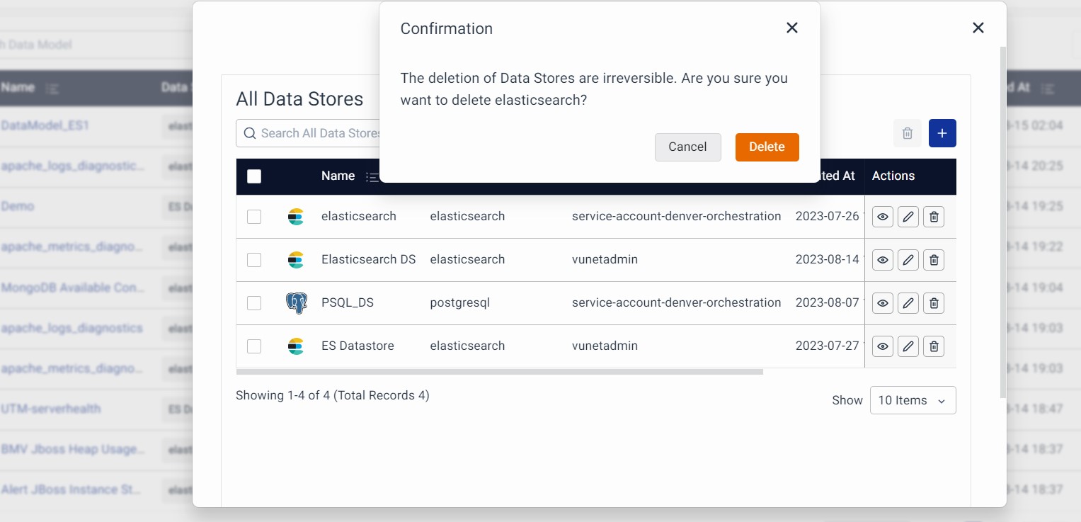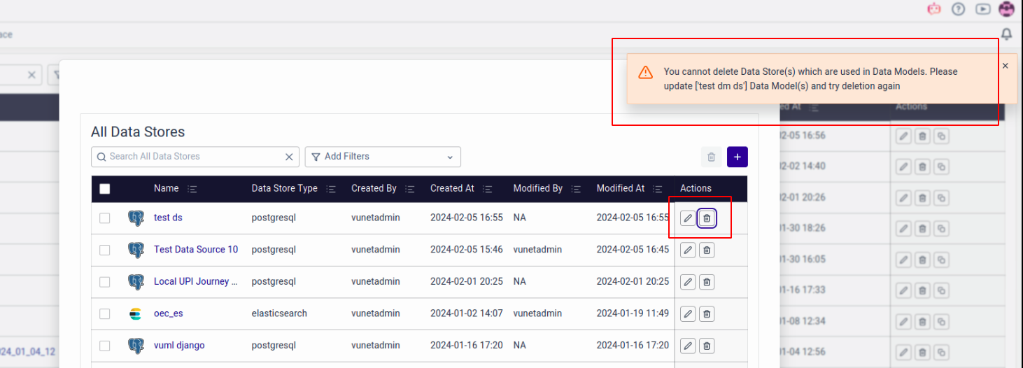 You can’t delete the Data Store if it is being used by any of the Data Models. The system will immediately throw an error.