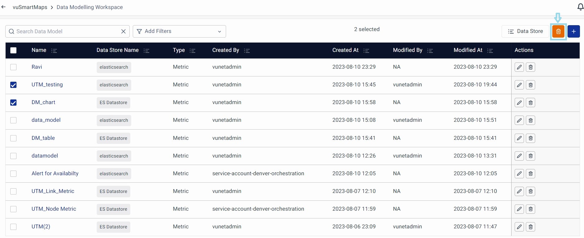 Deleting Multiple Data Models: Select the multiple Data Models by checking the boxes on the extreme left and clicking the Delete button on the top right.