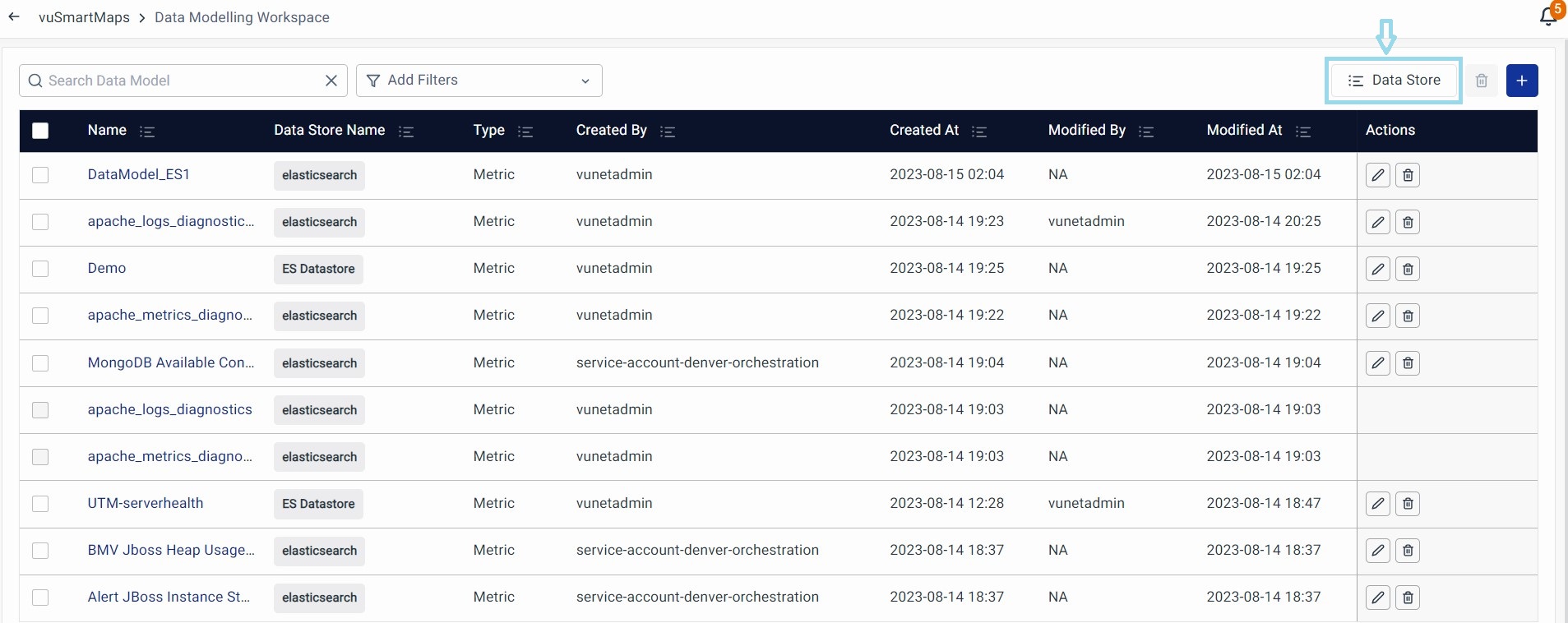 vuSmartMaps comes with the default configurations of NoSql and Hyperscale DB. You can easily add other supported data stores to the available data stores. Click on the Data Store button at the top right corner to see the listing of already configured data stores and also manage them.