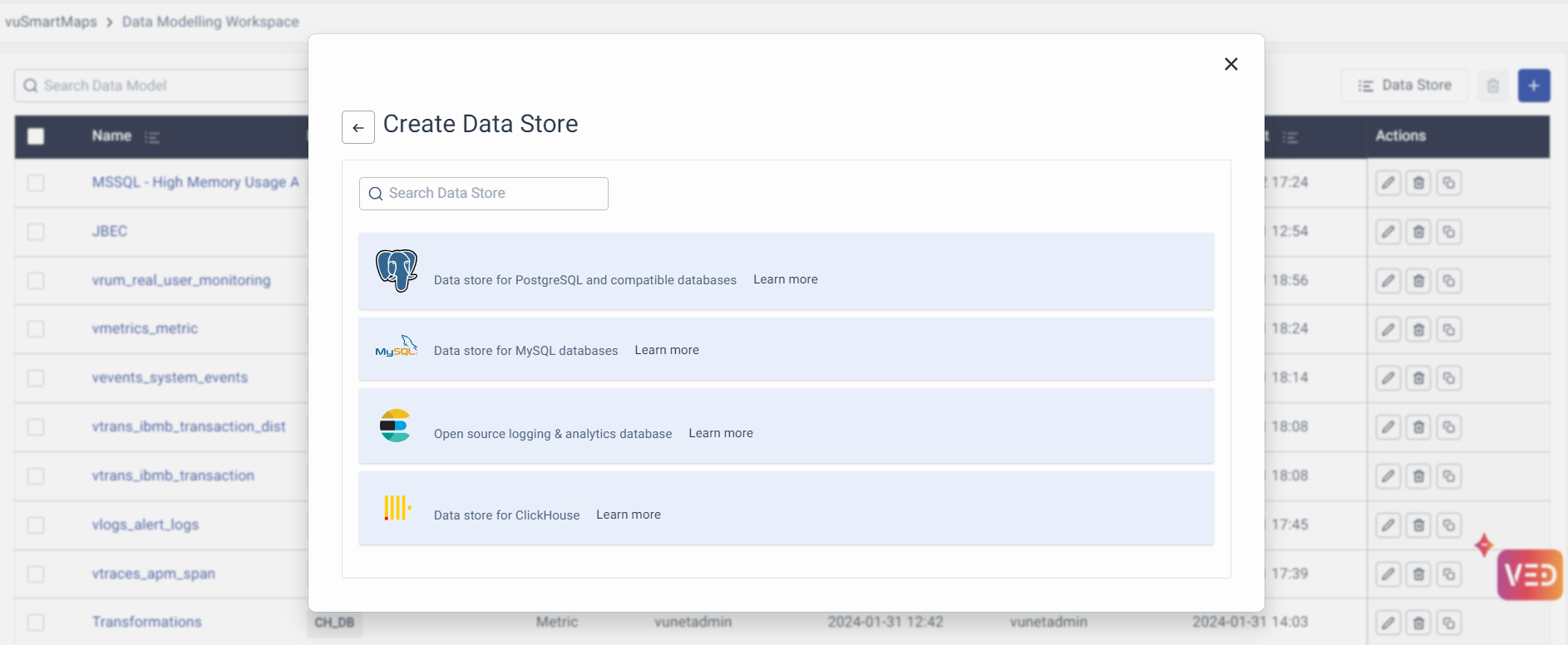 - Data Store: A data store is a repository for persistently storing and managing collections of data. Accessing and handling the data stores is simple and can be found at the top-left corner of the Data Models listing page. vuSmartMaps supports a variety of backend databases, making it highly adaptable to your needs. You can effortlessly query these Data Stores using a standard Query Editor or tailor your queries to the specific capabilities of each Data Store. Currently, Data Stores officially supports PostgreSQL, MySQL, Elasticsearch, and Hyperscale DB.
