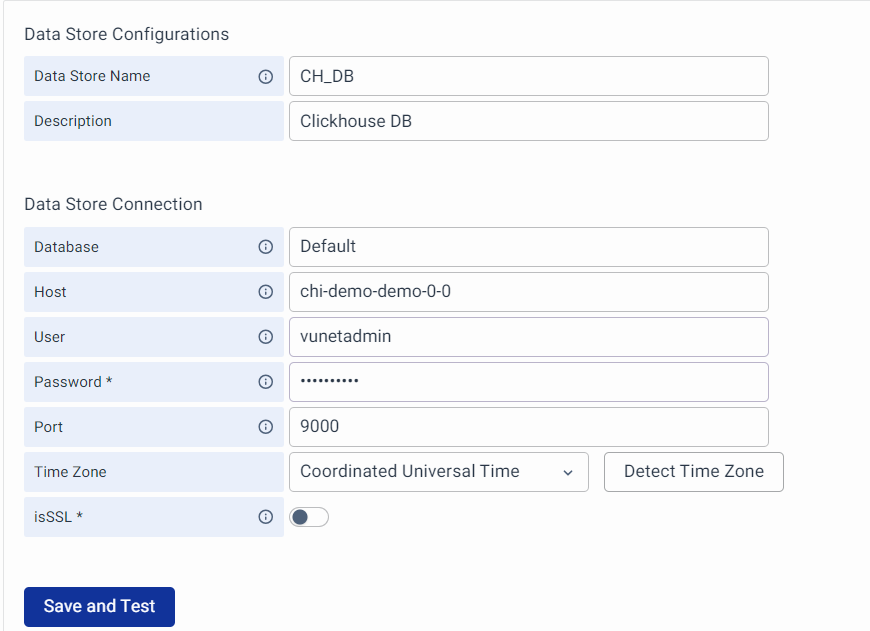 - isSSL: Enable it if you have SSL (Secure Sockets Layer) certified and enter the CA certificate details, Client Certificate, and vuSmartMaps.dataModels.labels.client_key.