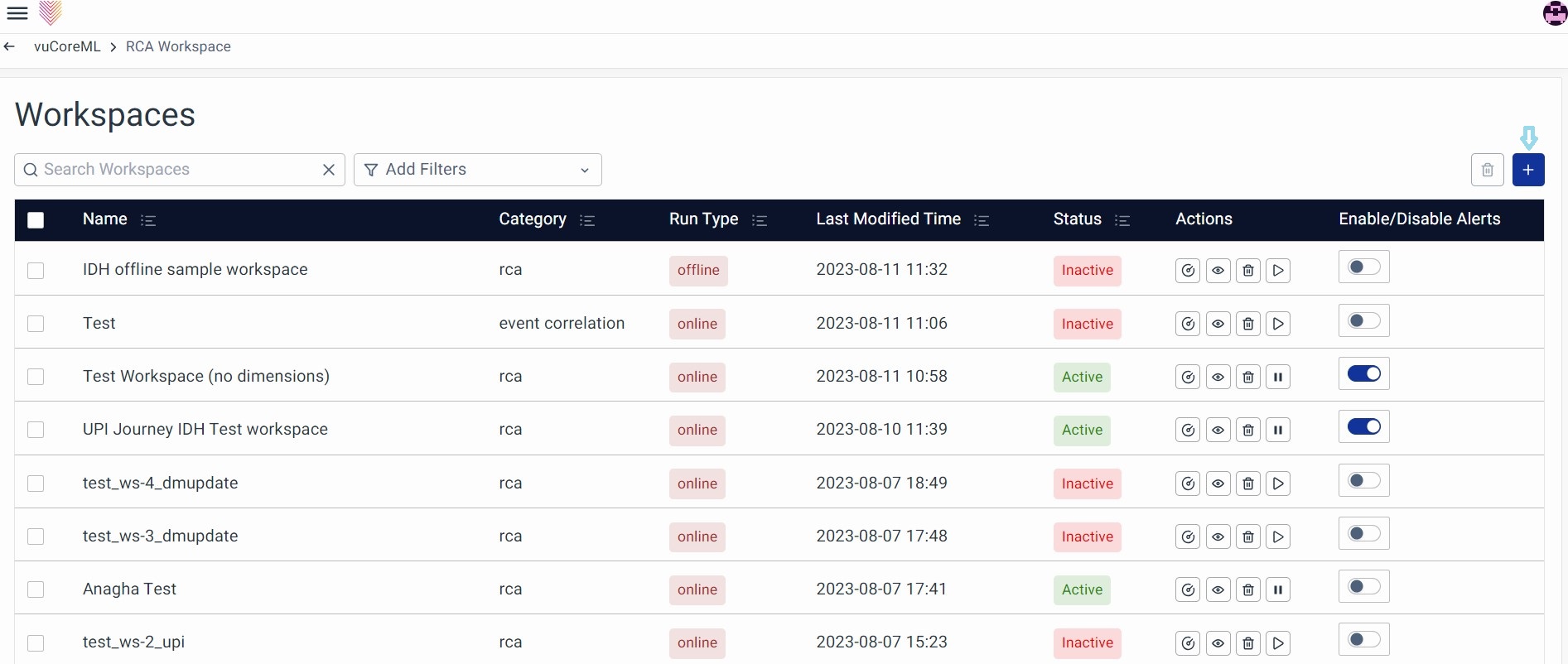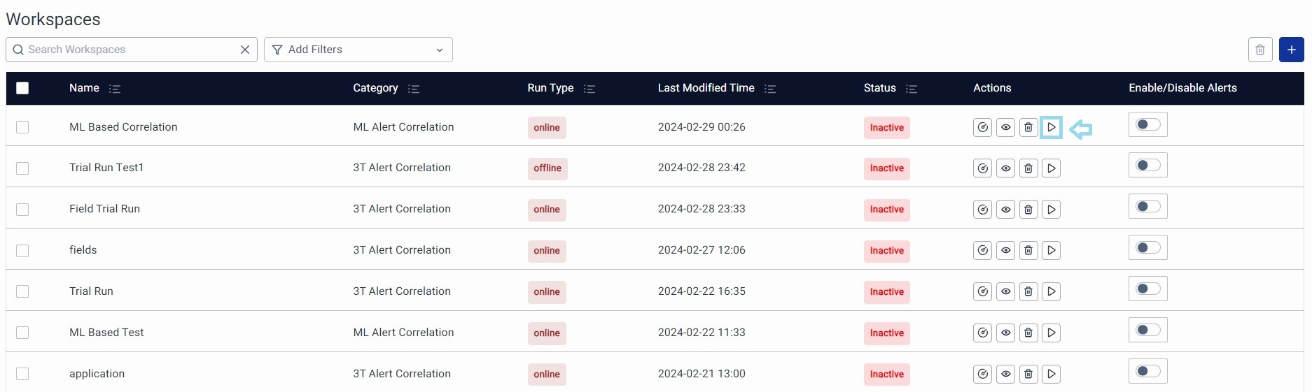 Click on the Finish button to complete the ML Alert Correlation configuration. And, you will arrive back at the listing page. Click on the Activate Workspace button from the Actions column.
