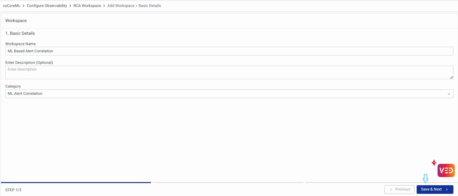 Enter the Workspace Name, Description, and select the Category as ML Alert Correlation. Click on Save and Next to create the Workspace.