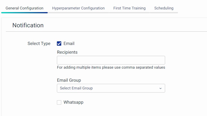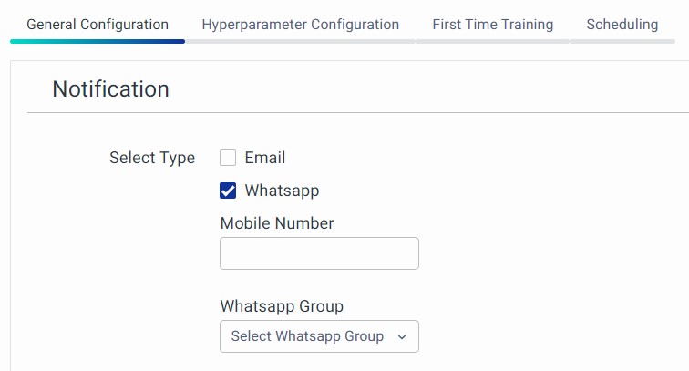 This is the first section and it allows you to configure notification types. It supports Email and WhatsApp notifications.